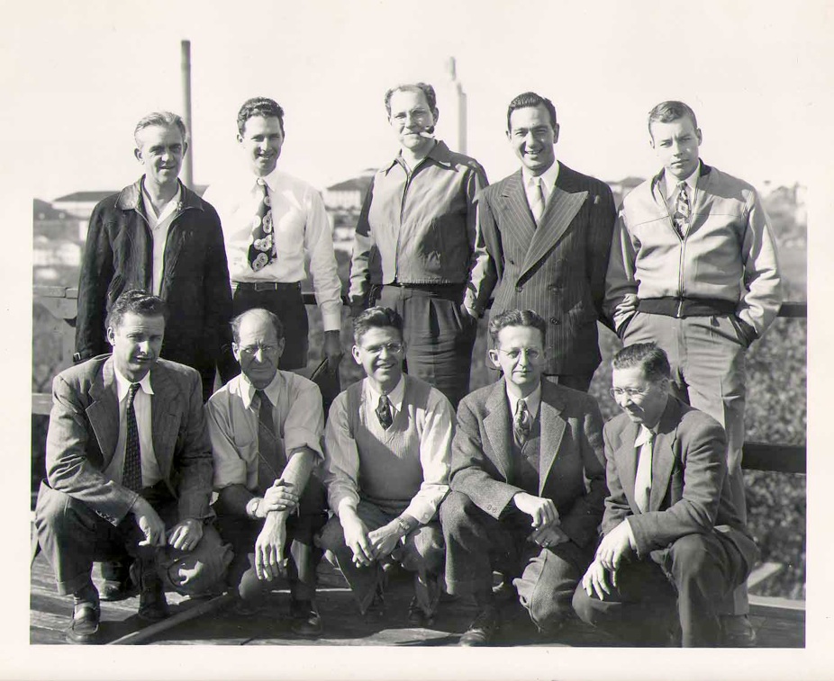 Back L to R: Groves, White, technician, Otto J. "Obie" Baltzer, division head, Walter Kuehne. physicist, Warren Hicks, technician, Clay Johnson, mechanical engineer Front L to R: Chester McKinney, physics graduate student, Tom Stevens, electronic technician, Frank Seay, physicist, Charles R. Rutherford, physicist, George Brooks, stock room clerk. |