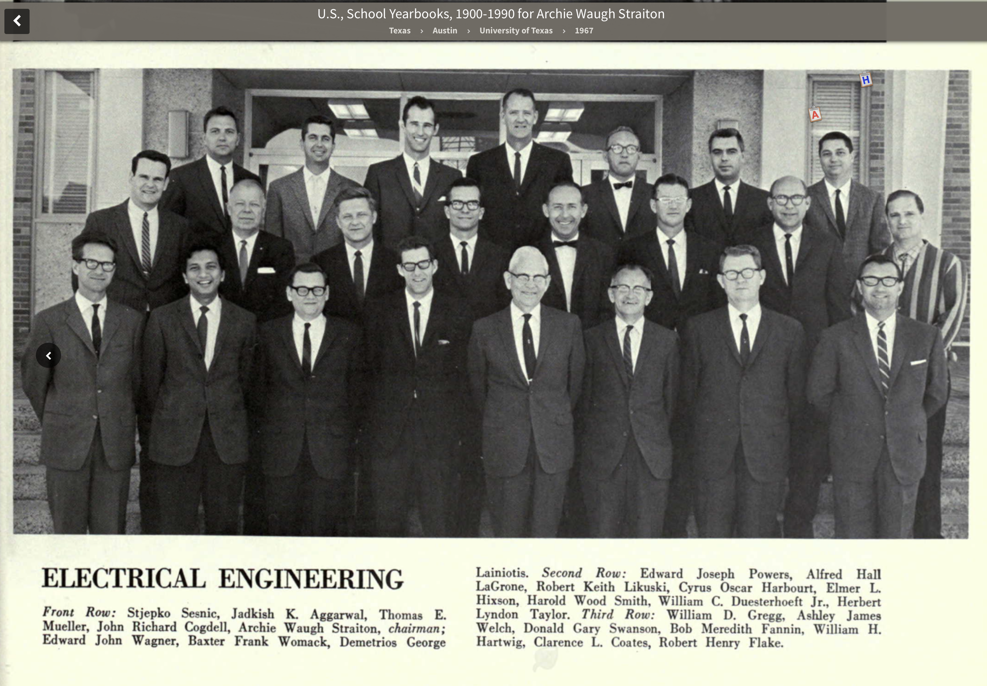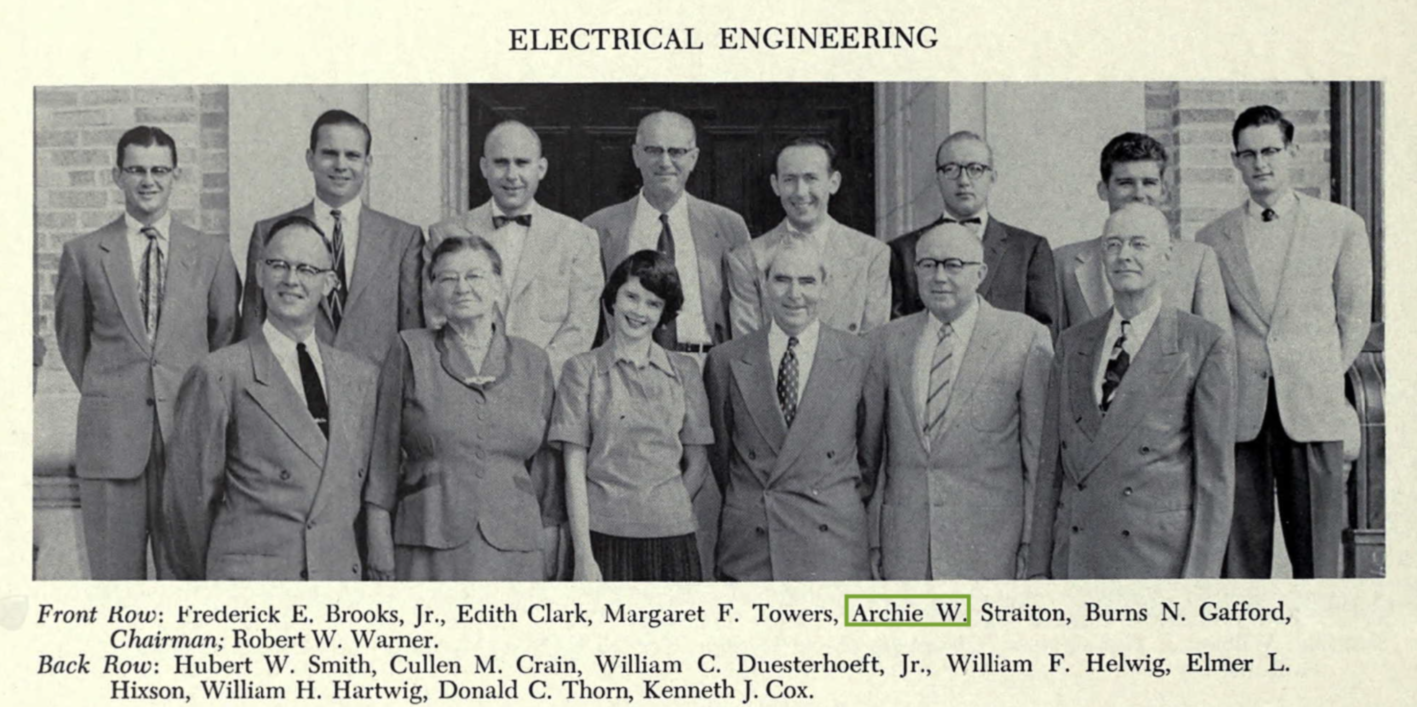 In 1931, Archie Waugh Straiton (1907–2000), earned an MA in physics with a thesis entitled, Measurement of the Propagation Characteristic of Electric Wave Filters. In 1939, he earned a PhD in physics. His dissertation, supervised by Professor S. Leroy Brown, was entitled, Solution of analytic and differential equations by harmonic processes. Straiton later joined the electrical engineering department and became chairman.
