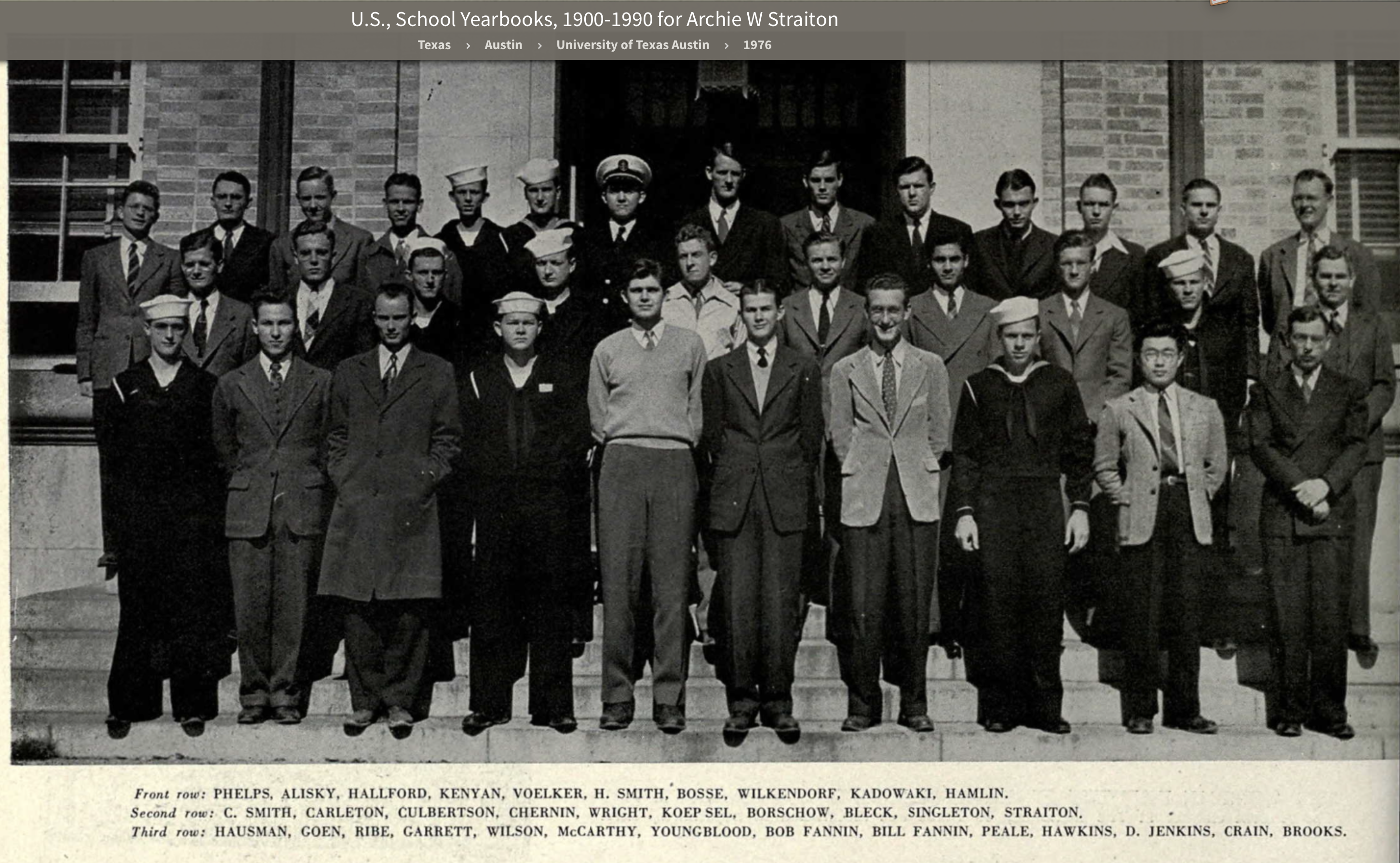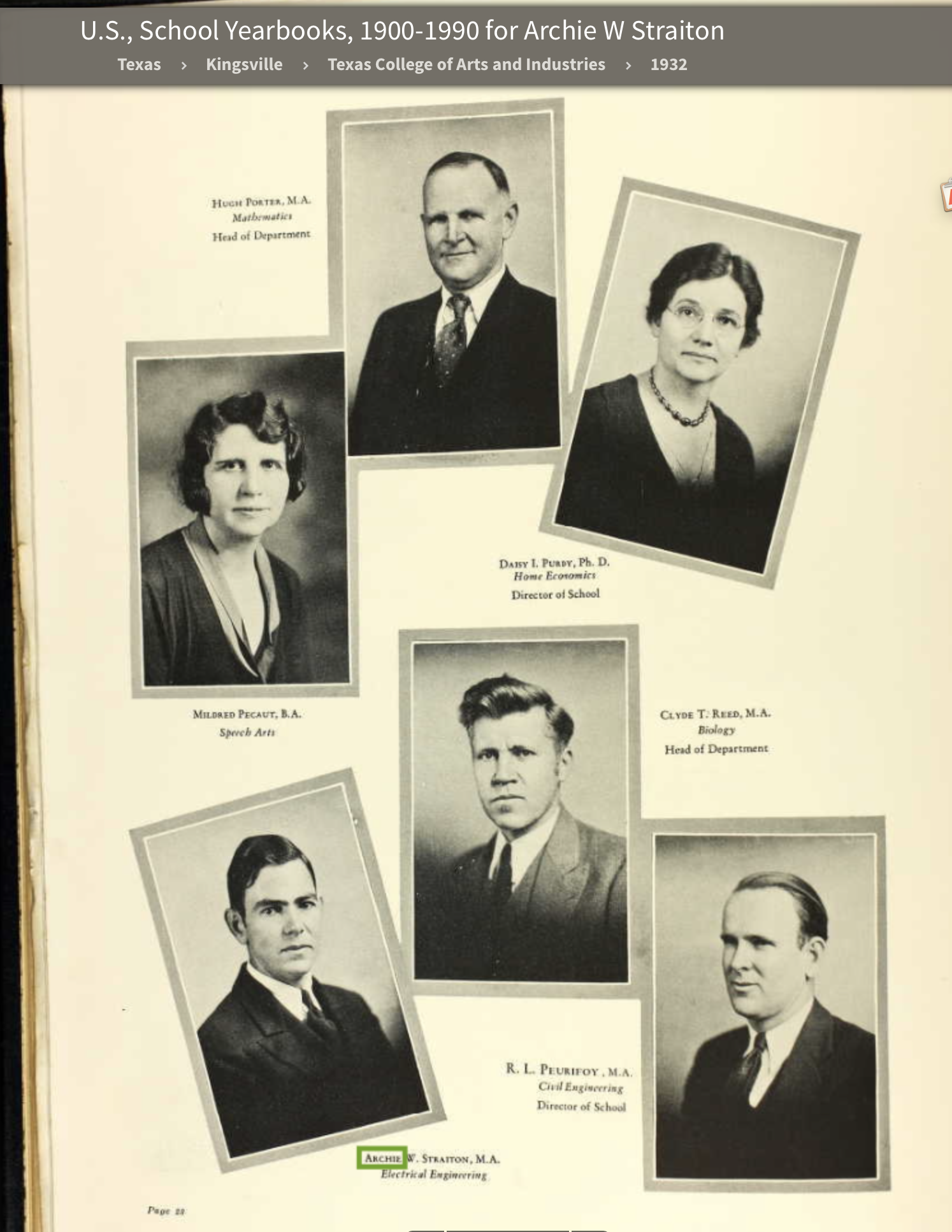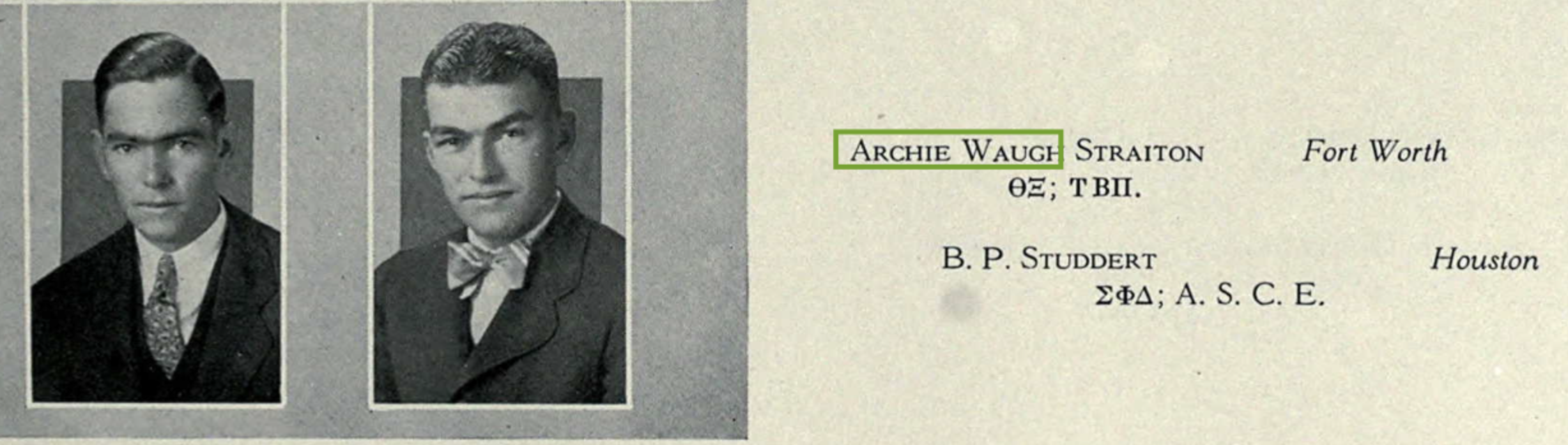 Archibald "Archie" Waugh Straiton was born on August 27, 1907, in Arlington, Texas, to Rev. John (1864–1951) and Jeannie Bell Waugh (1867–1944) Straiton. Archie's father, John was a minister born in Slamanan, Stirling, Scotland. Archie's mother, Jeannie was born in Rutherglen, South Lanarkshire, Scotland (her death certificate says Ireland). John and Jeannie and their eight children sailed from Londonderry, Ireland on April 24, 1906 and arrived in Boston on May 11, 1906. They next traveled to Ft. Worth, Texas. Their 1924 passport photo is at right. They were married May 18, 1888. Archie's siblings included Nellie Straiton (1889–1965), Catherine Patton Straiton Woodruff (1890–1968), David Straiton (1892–1959), Janet Waugh "Nettie" Straiton (1893–1979), Alexandrina W. "Ina" Straiton Crites) (1895–1990), Jean Straiton Armstrong (1897–1984), John Alexander Paton Straiton (1900–1958), James Waugh Straiton (1905–1982). Archie was born after their arrival in the US.