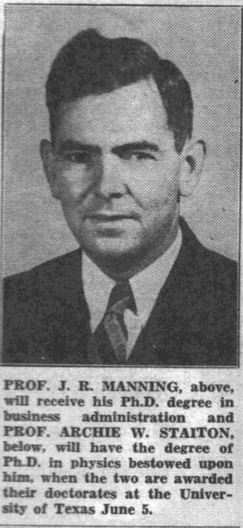 He received a BS in electrical engineering and an MS in physics from The University of Texas at Austin in1929 and 1931, respectively. He then took a teaching job at Texas A&I College in Kingsville, where he remained for four years. He returned to UT Austin to continue his graduate study and received a PhD in physics in 1939. (His thesis was entitled, "The Solution of Differential and Analytic Equations by Harmonic Processes" and was supervised by Professor S. Leroy Brown. )
