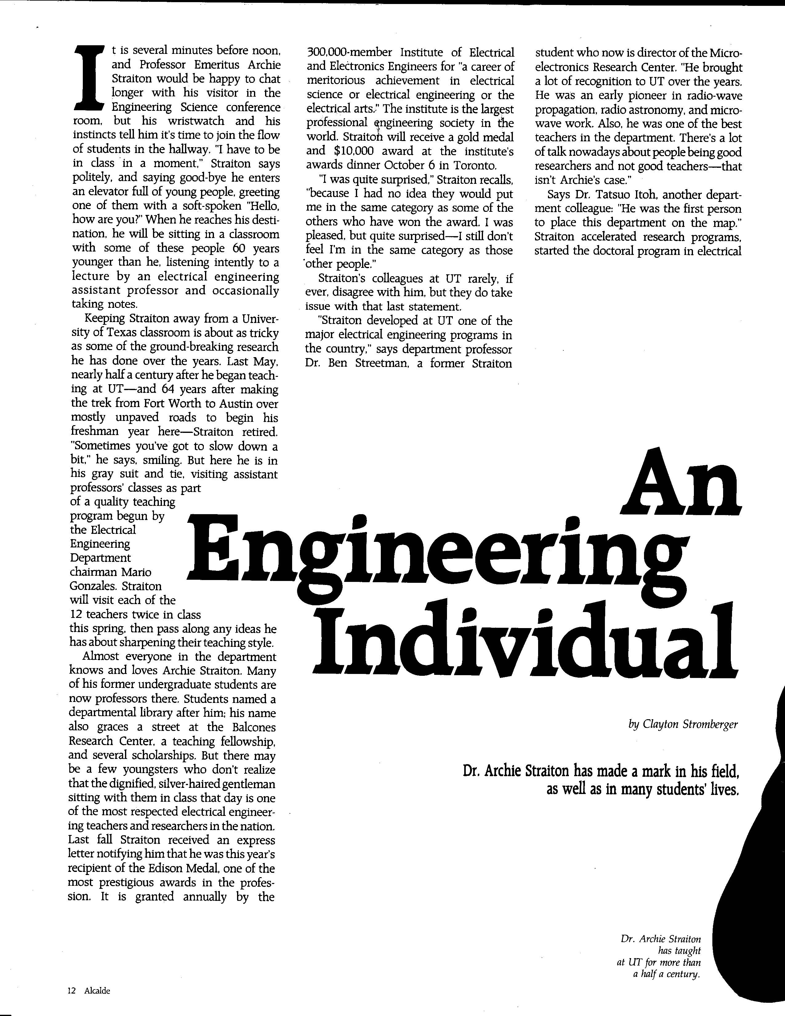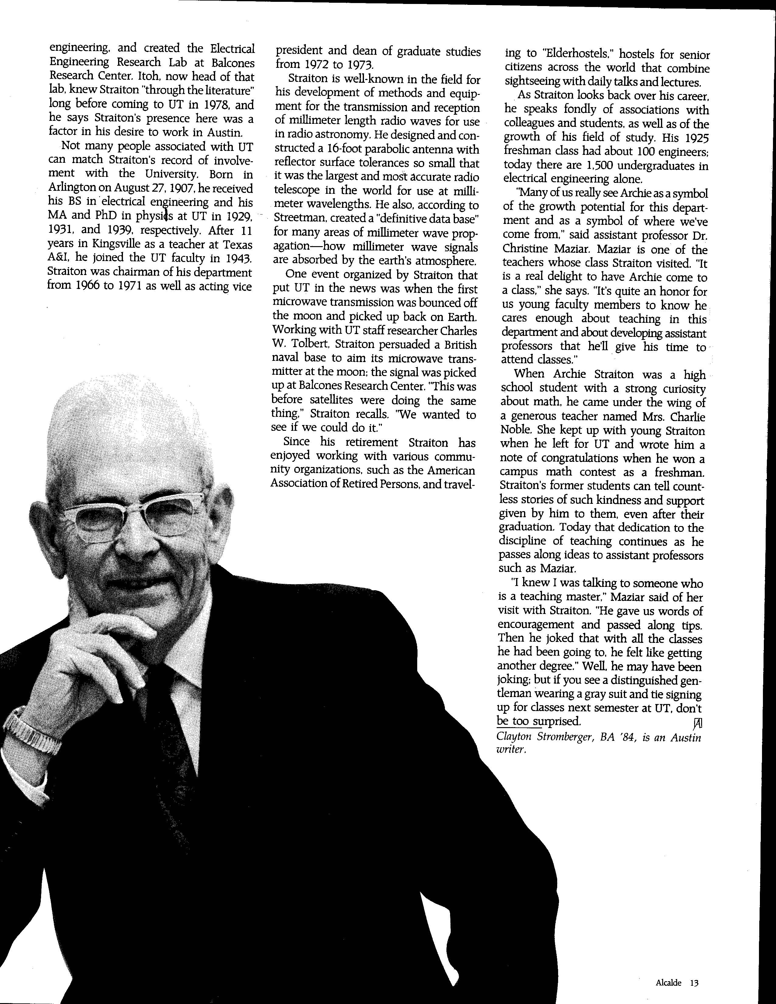 Dr. Straiton’s achievements as both a researcher and an educator received national recognition when he was elected to membership in the National Academy of Engineering. (His National Academy recognition came in 1976. At that time it was noted that Dr. Straiton had supervised more that 63 master's theses and 27 PhD dissertations and was the author of more than 100 technical articles in professional journals. He served as a U. S. delegate to seven general assemblies of the International Scientific Radio Union.—Mel Oakes) This was followed by his receiving the prestigious Edison Medal from the Institute of Electrical and Electronic Engineers (IEEE), a professional organization of which he was also named a Fellow. The citation for the Edison Medal reads “for an outstanding career in electrical engineering with significant contributions in the field of radio propagation and astronomy, and in engineering education.” At the University he received a Presidential Citation and was named a Distinguished Engineering Graduate.