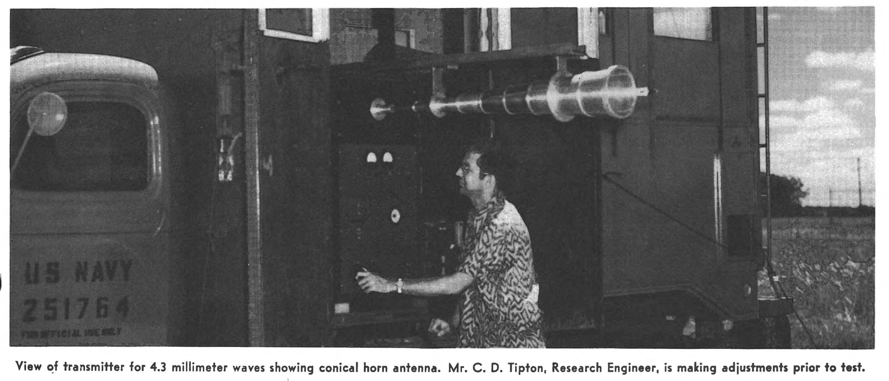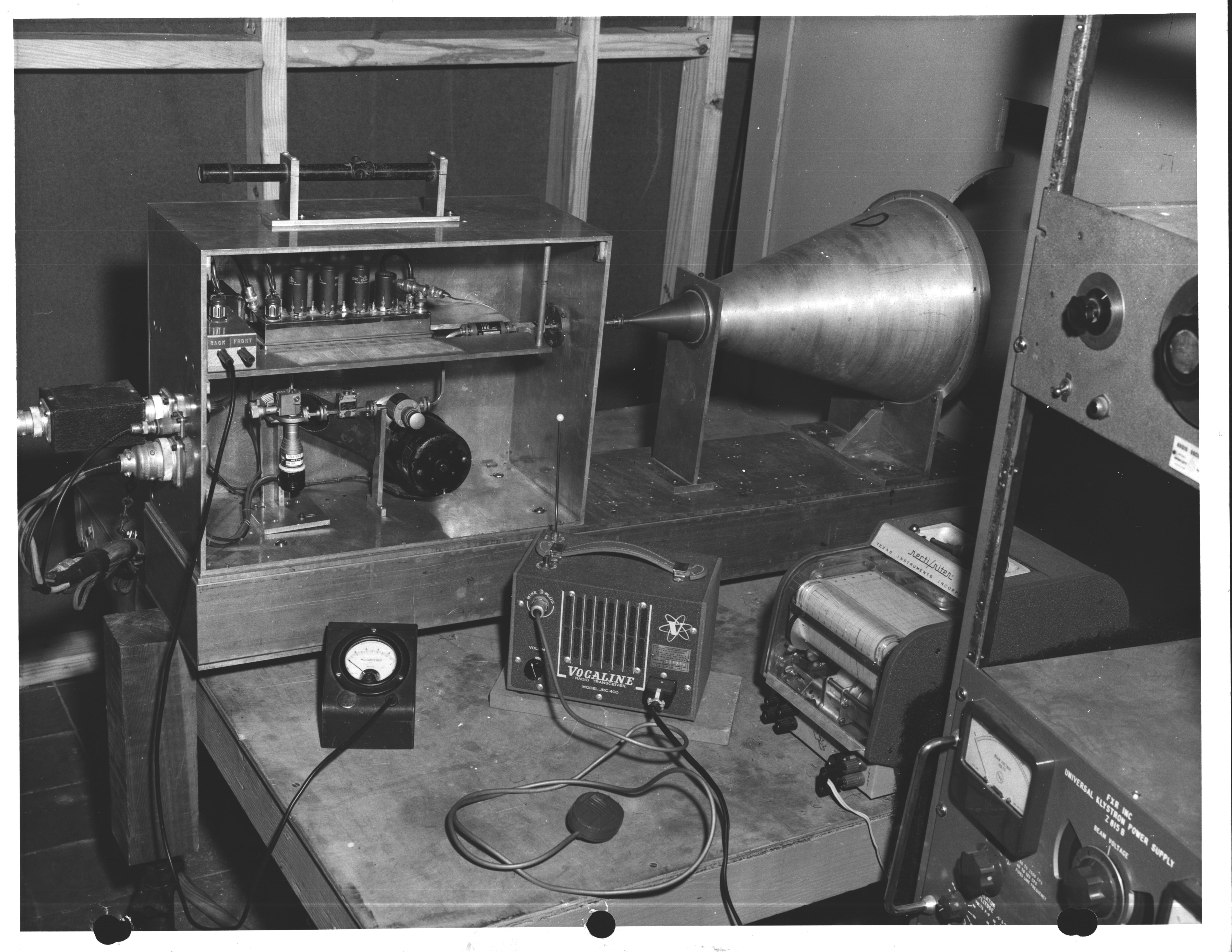 Archie Straiton's 3mm receiver. A similar receiver was installed on the 25th floor of the University Tower, seven miles from a truck mounted transmitter at the Balcones Research Center and also Mount Larson. This was likely the longest distance the 4.3 millimeter waves had been transmitted by man. The year was 1954. The work was carried out by Professor Archie Straiton and research engineers, C. W. Tolbert (at right) and C. D. Tipton. |