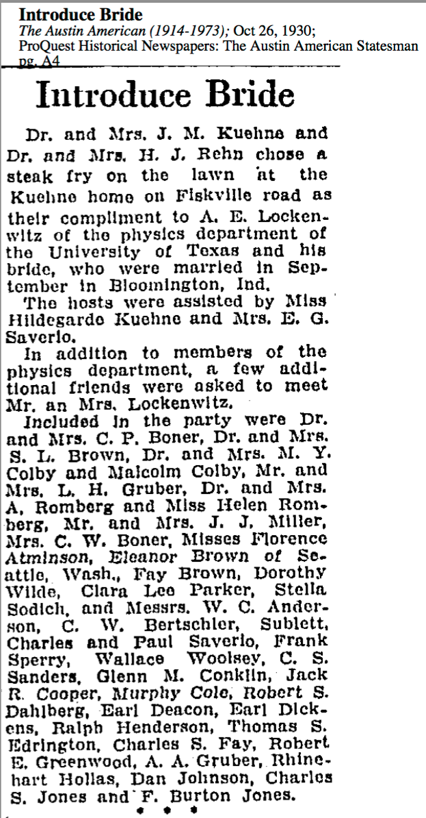 Arthur joined the faculty of the University of Texas at Austin as an instructor in 1928 at a salary of $1800/9 months. He remembers professors’ salaries in the $4000 range. In 1932, all salaries were cut by 25%. The physics department was in the basement of the old Main Building.