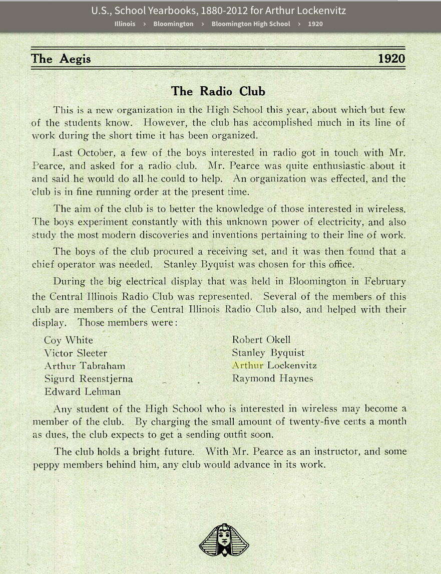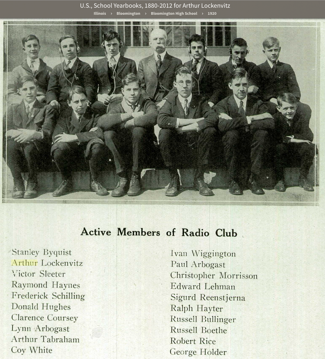 Arthur and his sister, Marie, attended Bloomington High School. Arthur graduated in 1920. He was a member of an active Radio Club in high school.