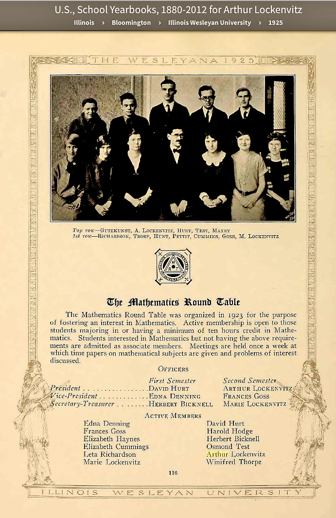 Arthur E. Lockenvitz, Illinois Wesleyan U., 1925, second row from left, back row. Math Club. |