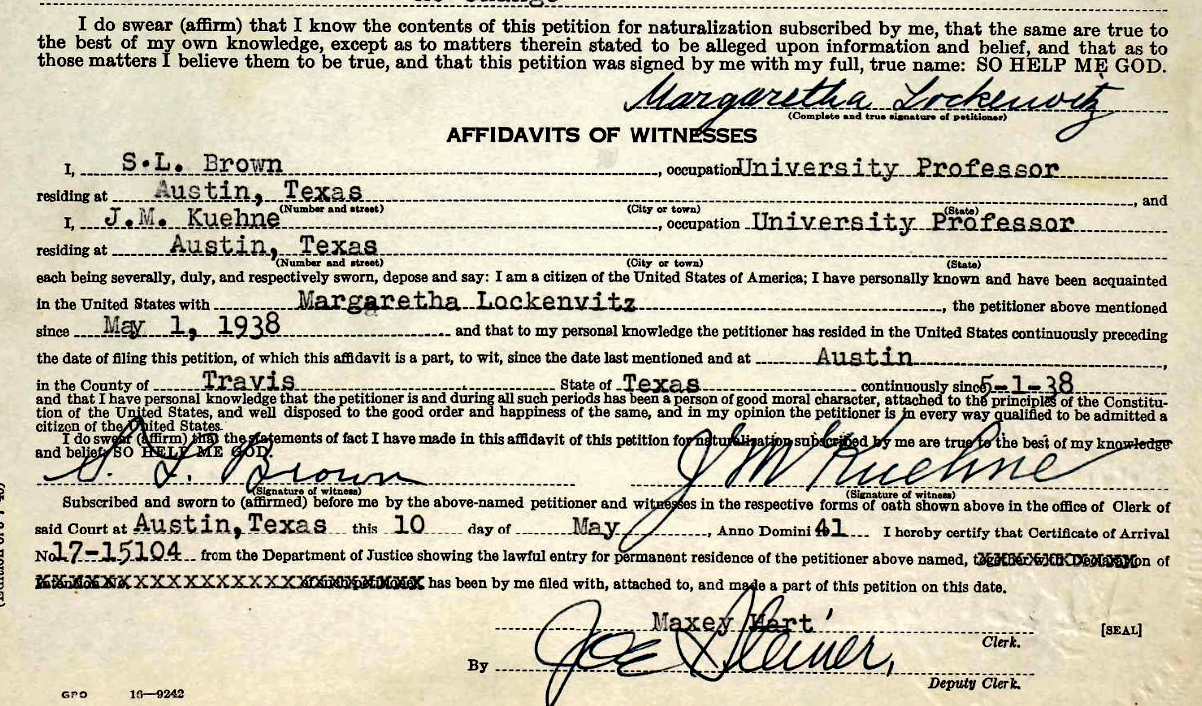 Margaretha petitioned for naturalization in 1941. Note in the affadavit below that Professor S. Leroy Brown and Professor John M. Kuehne signed as witnesses for Margaretha.