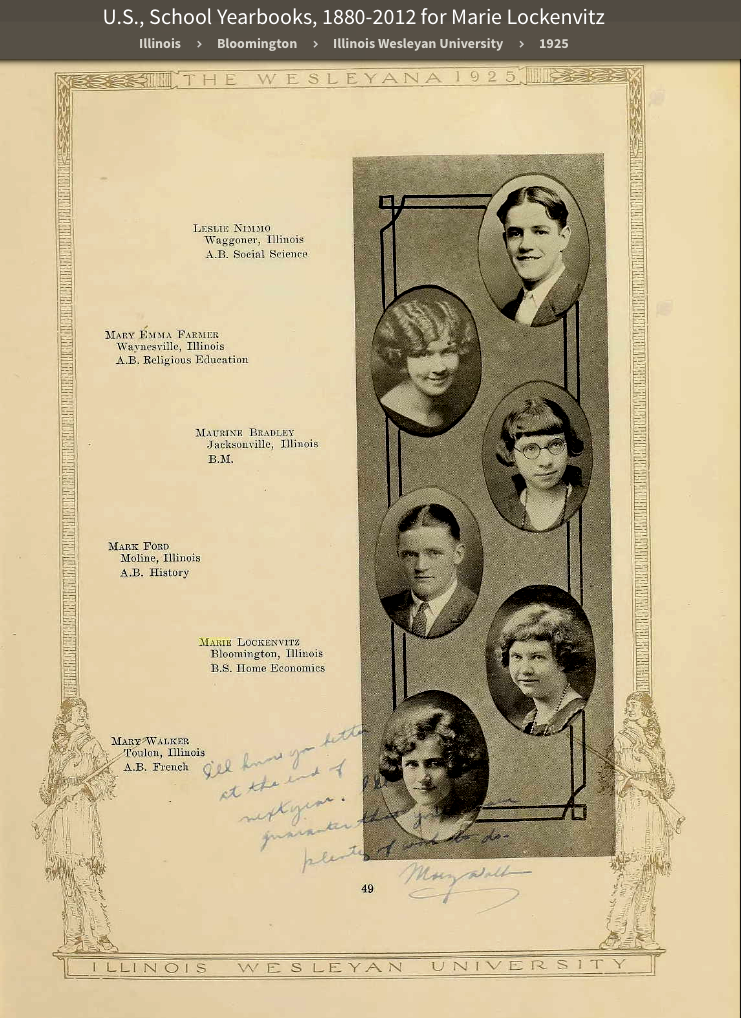 Marie Lockenvitz, Illinois Wesleyan Univerisity, 1925, Marie second from the bottom of column. |