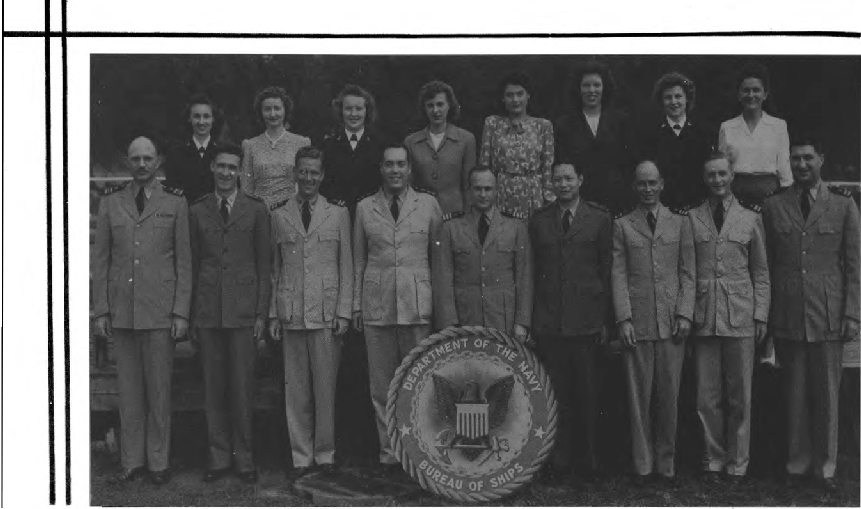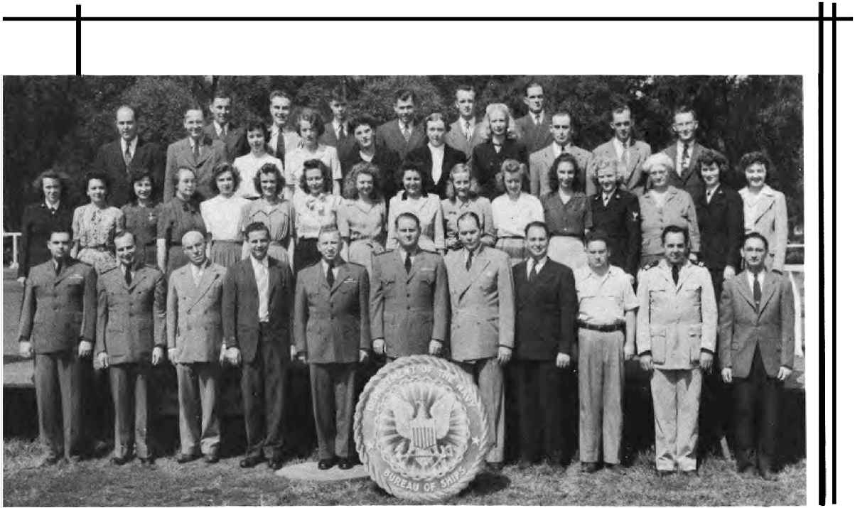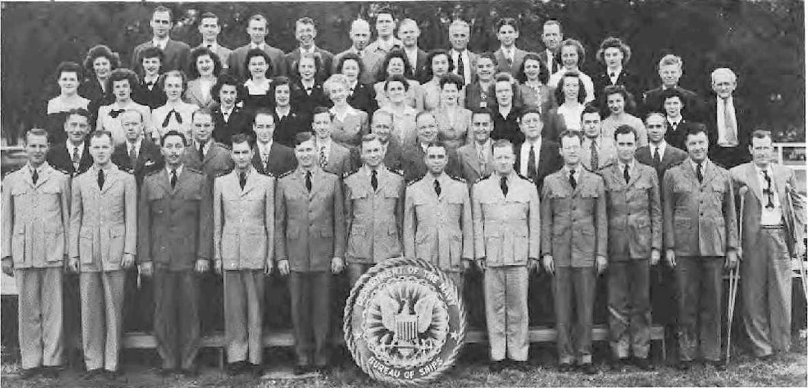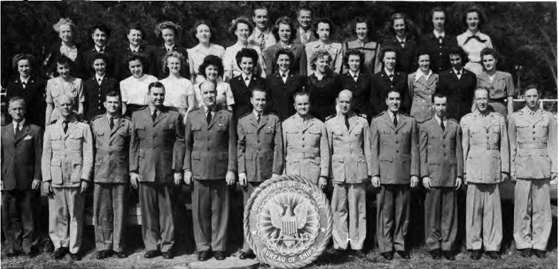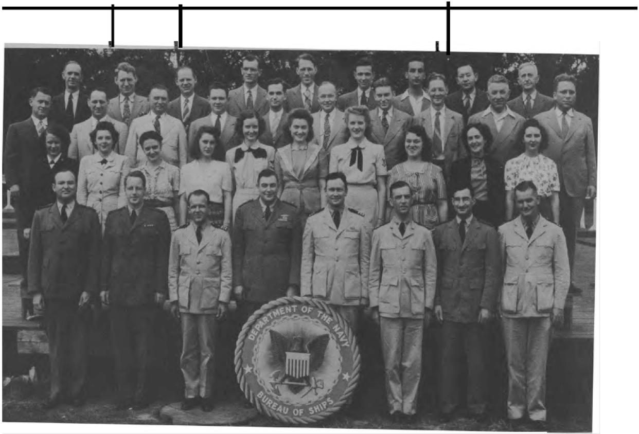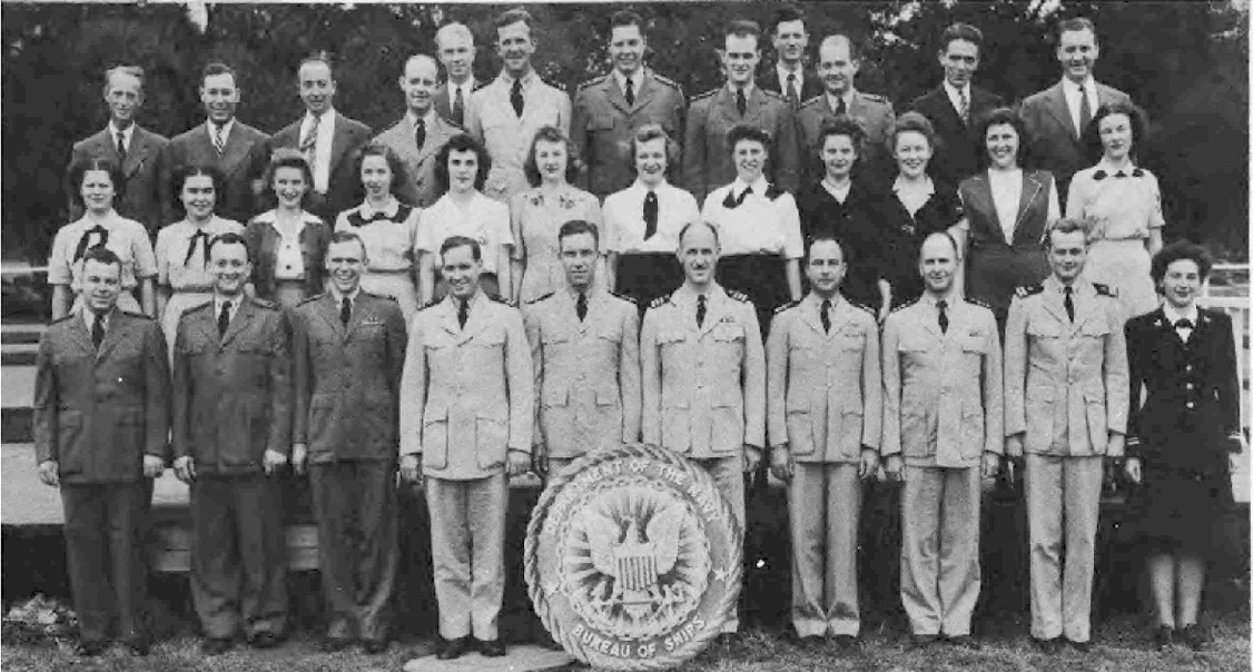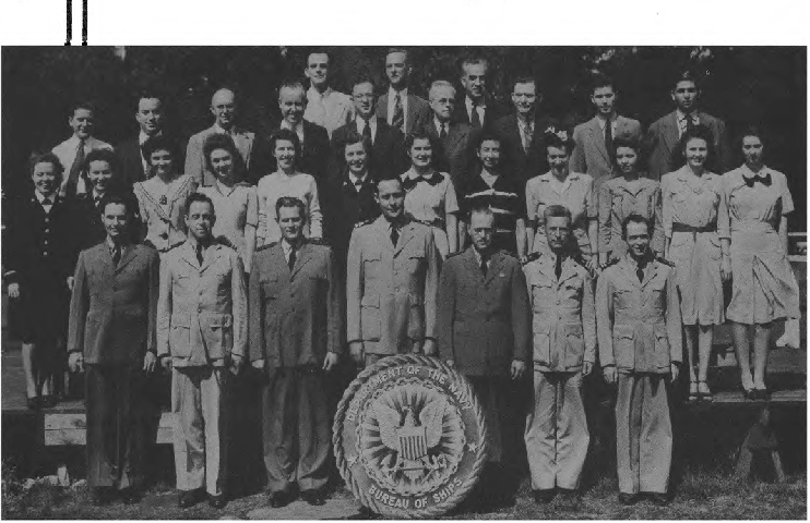 " I spent WWII working on the physics of underwater sound, mainly in connection with submarine and anti-submarine warfare. Most of that WWII work was done while I was a member of the Sonar Analysis Group (SAG), which was located in the Empire State Building and was a subdivision of the Columbia University Division of War Research. The SAG was headed by Lyman Spitzer. My duties frequently took me to the Navy Dept. in D.C., however; indeed I spent the last year of the war fully located in D.C., with an office in the Navy submarine warfare division (whose formal designation I have forgotten). Thus, although you found the photo in a Bureau of Ships yearbook, I suspect that many of the people in the photo were associated with the U.S. Navy; certainly the photo's caption identifies a number of commissioned officers, and it well may be that other persons in the picture either were non-commissioned or worked with the named officers. The only officer in the photo whom I recall knowing is Roger Revelle, who was the Navy's liaison to the SAG; thus we spent many many hours together. I presume you know how to locate his family, but just in case that seemingly quite sound presumption is erroneous I'll remind you that Roger married into the Scripps family and, as such, exerted the major political pressure for founding the branch of the University of California at La Jolla. Indeed portions of the La Jolla UC branch bear his name and--if I am not mistaken--he was the first Chancellor of the La Jolla branch."—Edward Gerjuoy (Professor Gerjuoy died in 2018.)