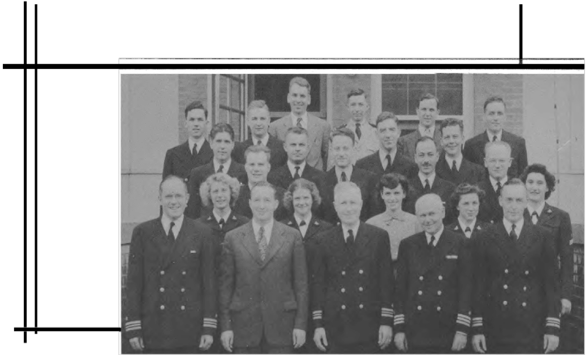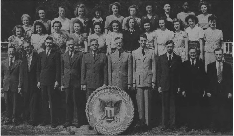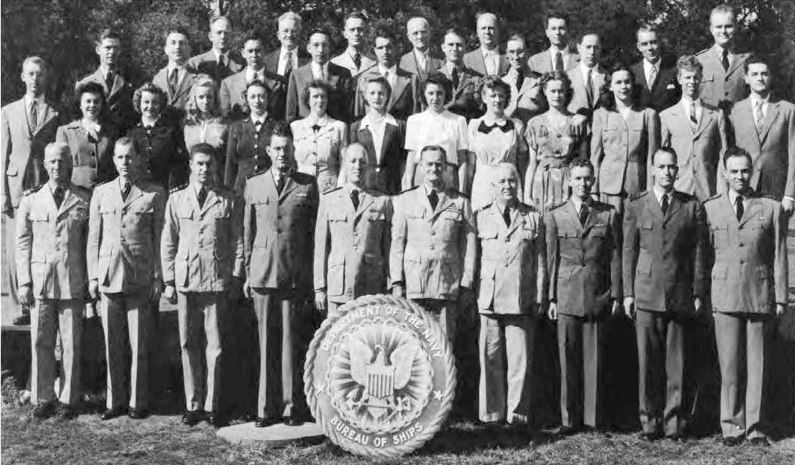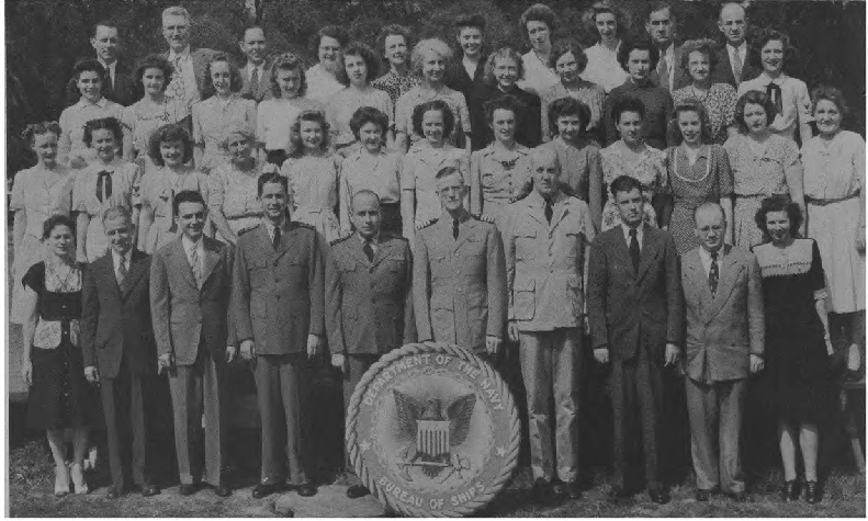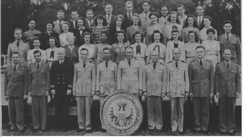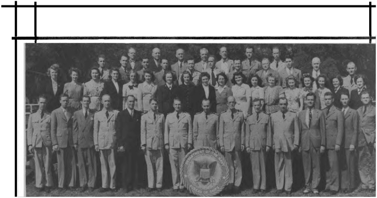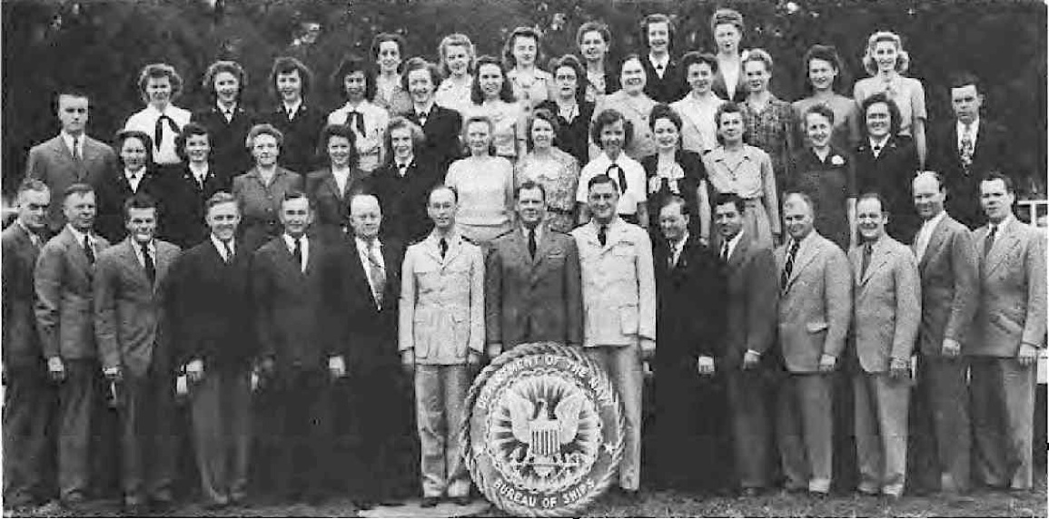 " I spent WWII working on the physics of underwater sound, mainly in connection with submarine and anti-submarine warfare. Most of that WWII work was done while I was a member of the Sonar Analysis Group (SAG), which was located in the Empire State Building and was a subdivision of the Columbia University Division of War Research. The SAG was headed by Lyman Spitzer. My duties frequently took me to the Navy Dept. in D.C., however; indeed I spent the last year of the war fully located in D.C., with an office in the Navy submarine warfare division (whose formal designation I have forgotten). Thus, although you found the photo in a Bureau of Ships yearbook, I suspect that many of the people in the photo were associated with the U.S. Navy; certainly the photo's caption identifies a number of commissioned officers, and it well may be that other persons in the picture either were non-commissioned or worked with the named officers. The only officer in the photo whom I recall knowing is Roger Revelle, who was the Navy's liaison to the SAG; thus we spent many many hours together. I presume you know how to locate his family, but just in case that seemingly quite sound presumption is erroneous I'll remind you that Roger married into the Scripps family and, as such, exerted the major political pressure for founding the branch of the University of California at La Jolla. Indeed portions of the La Jolla UC branch bear his name and--if I am not mistaken--he was the first Chancellor of the La Jolla branch."—Edward Gerjuoy (Professor Gerjuoy died in 2018.)