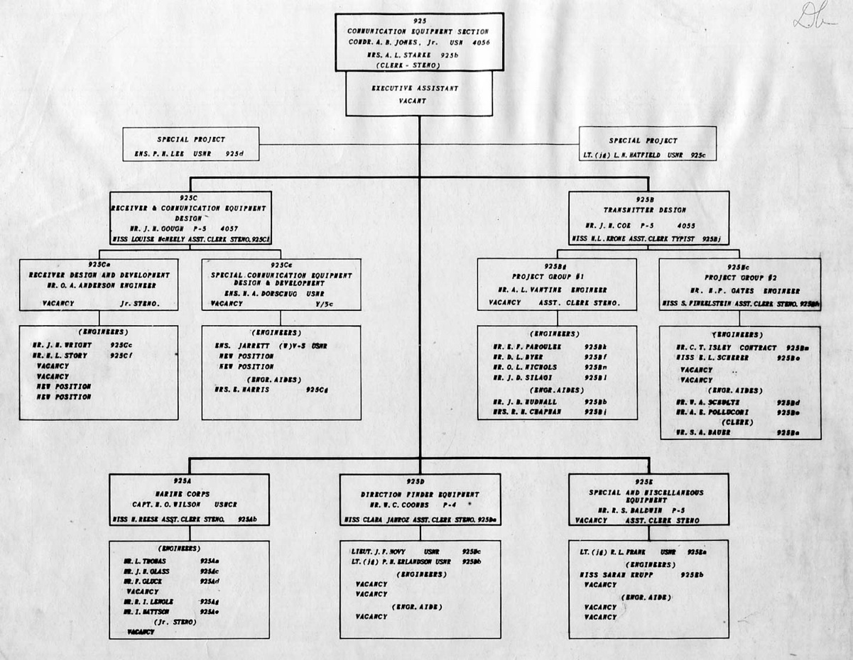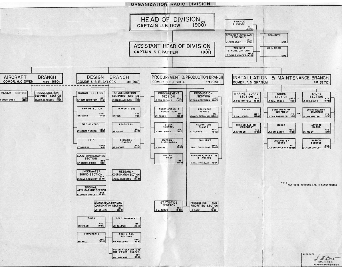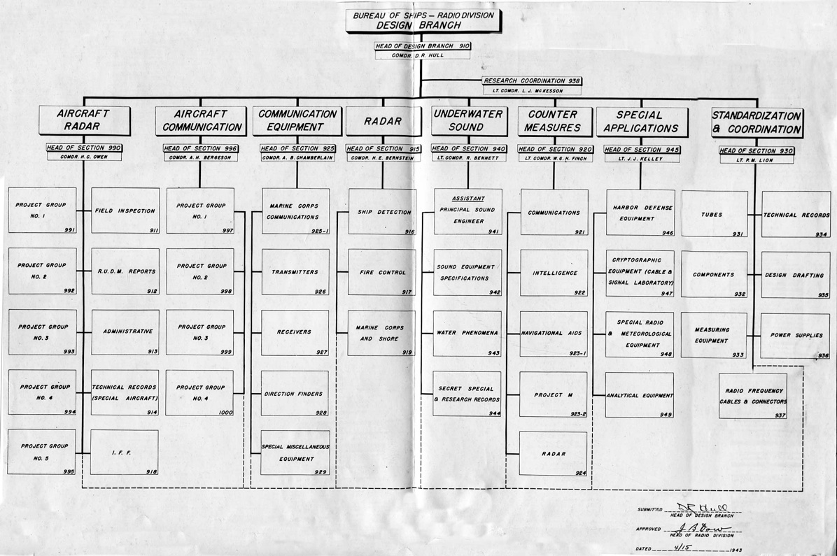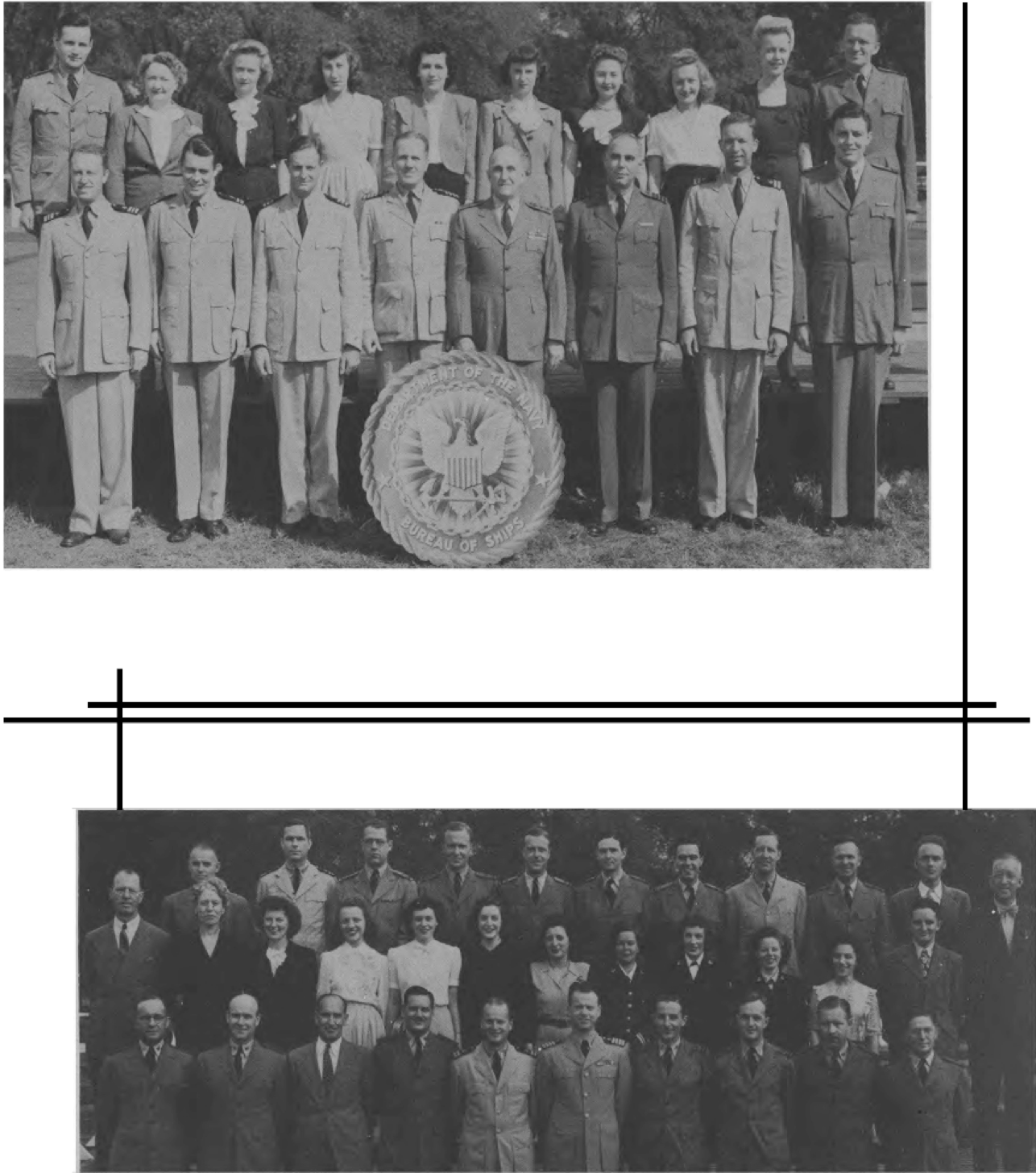 " I spent WWII working on the physics of underwater sound, mainly in connection with submarine and anti-submarine warfare. Most of that WWII work was done while I was a member of the Sonar Analysis Group (SAG), which was located in the Empire State Building and was a subdivision of the Columbia University Division of War Research. The SAG was headed by Lyman Spitzer. My duties frequently took me to the Navy Dept. in D.C., however; indeed I spent the last year of the war fully located in D.C., with an office in the Navy submarine warfare division (whose formal designation I have forgotten). Thus, although you found the photo in a Bureau of Ships yearbook, I suspect that many of the people in the photo were associated with the U.S. Navy; certainly the photo's caption identifies a number of commissioned officers, and it well may be that other persons in the picture either were non-commissioned or worked with the named officers. The only officer in the photo whom I recall knowing is Roger Revelle, who was the Navy's liaison to the SAG; thus we spent many many hours together. I presume you know how to locate his family, but just in case that seemingly quite sound presumption is erroneous I'll remind you that Roger married into the Scripps family and, as such, exerted the major political pressure for founding the branch of the University of California at La Jolla. Indeed portions of the La Jolla UC branch bear his name and--if I am not mistaken--he was the first Chancellor of the La Jolla branch."—Edward Gerjuoy (Professor Gerjuoy died in 2018.)