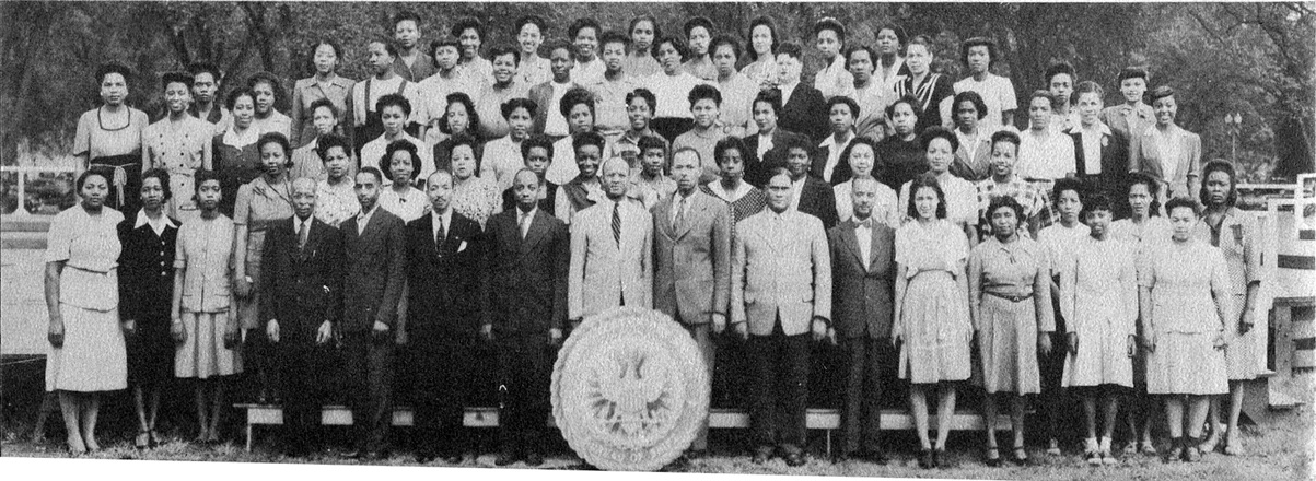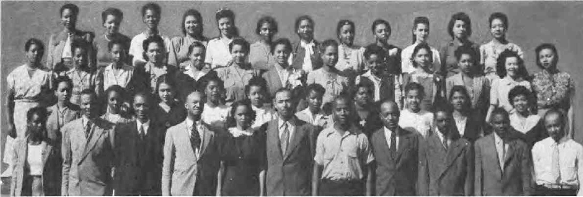 Front Row (L to R)-M. Lassery, W Watson, L. W. Powell, L. Branch, J.D. Pettis, T E. Howse, J. E. Fisher, T. E. Lee, E. Whitted, C. Thomas, A. Wells, H. Wynn, M. Cosby. Second ~ow (L. to R)-E. Taylor, M. Reed, G. Gregory, D. Darden, B. Washington, A. Davis, R. Bailey, L. Wade, L. Benbow, D. Grant, C. Wilson, R. Crump, C. Thornton, M. Anderson. Third Row (L to R)-H. Russell, A. Herring, H. Parker, E. Meeds, B. Lindsay, J. Alston, V. Gill, A. Sutton, A. V. Hough, S. Friend, I. Tolson, L. White, E. Reid, E. Hosely, L. J. Smith. Fourth Row (LtoR)-M. Bundy, W. Jones, C. Glover, V. Greenfield, E. Beale, P. Smith, J. G. Johnson, H. Bullock.