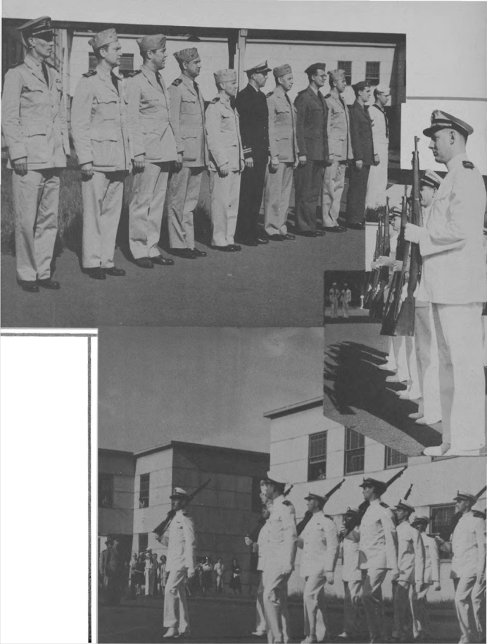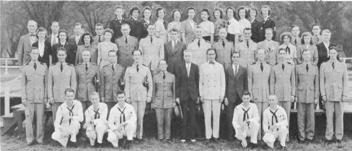 Front Row (L. to R.)—Lt. C. B. Sears, Lt. (jg) J. E. Millar, Lt. O. Skinner, Lt. (jg) J. M. Tuttle, Lt. C. A. Fisher, Lt. Cdr. J. W. Blackburn, Lt. (jg) I. Fox, Lt. W. E. Watkins, Lt. H. G. Irion, Lt. C. M. Jones, Lt. J. M. MitchelL. Second Row (L. to R.)—G. Acosta Y3-c, A. Gosnell, M. Murphy, J. Zelik Y2-c, M. Swango, A. Foutts Y2-c, B. Copelan, E. Hawkins Yl-c, H. Boykoff, P. Jones, Lt. (jg) D. Dudley, B. Bowen, L. O'Hara. Third Row (L. to R.)—L. Nance, S. Goodman, J. Parker, D. McKinney, G. Steinbuch, B. Nelson Y3-c, V. Terminello, Ens. V. Johnson, W. Grady, L. Lovett, Wilbur Perine, Lt. M. R. Huse, P. White, N. Abbott, Dean S. Young, A. Brady.