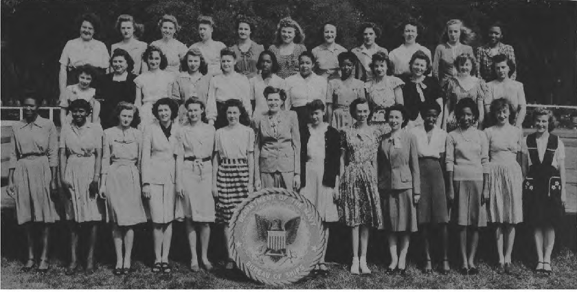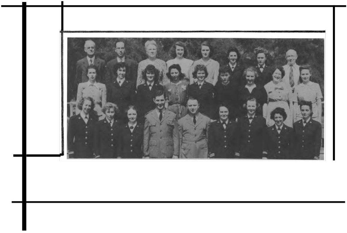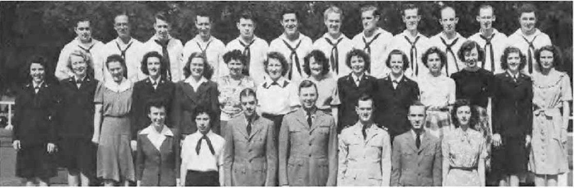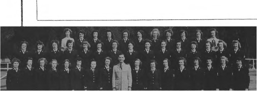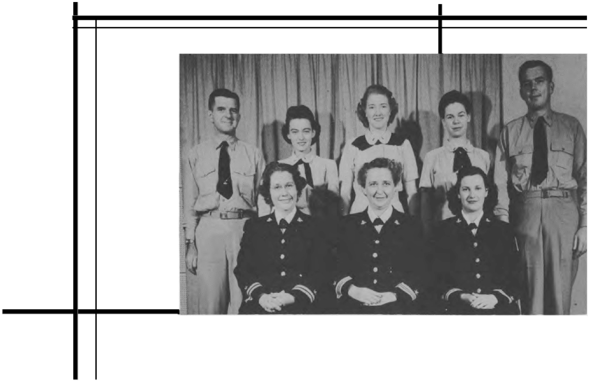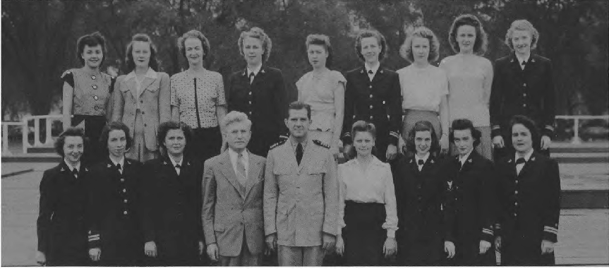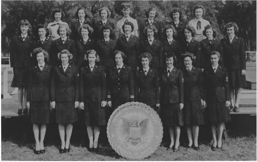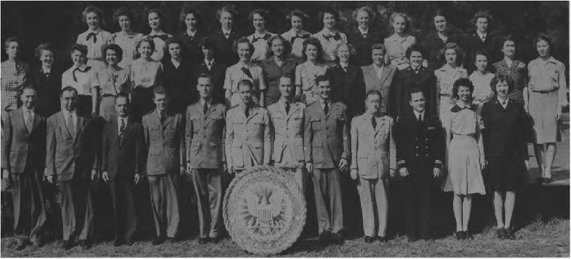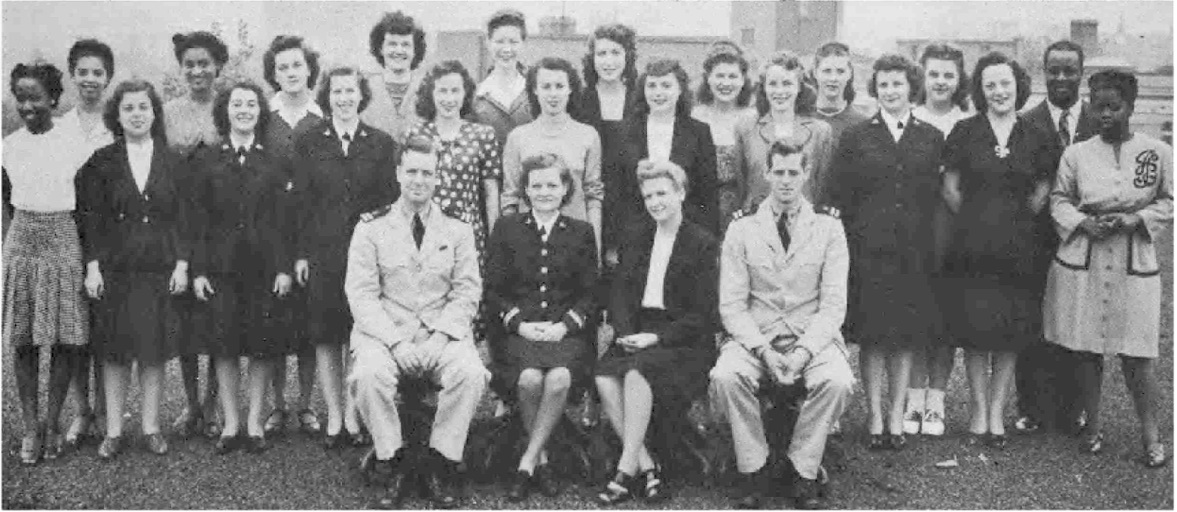 Second Row (L. to R.)—S. M. Happy, M. Walters, E. Mabrey, Ens. D. M. Zimmer, A. Marsh, Ens. E. K. Pinkham, I. Rodgers, J. Haas, B. J. Clark Y3-c, M. Todd, Ens. A.M. Sullivan, N. Waddy, V. Lewis, O. G. Frederick. Third Row (L. to R.)—M. T. McDade, A. Ludington, Ens. M. Starbuck, Ens. J. C. Dwight, E. K. Peterson, R. Still, Ens. R. Fitzpatrick, Ens. E. G. O'Mara, E. Berndt, H. Cahill, L. M. Gorsuch.