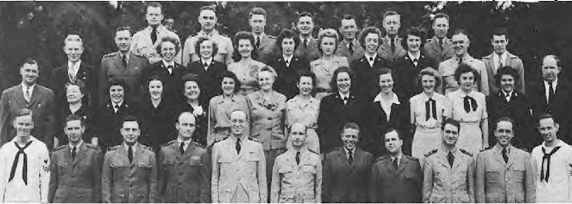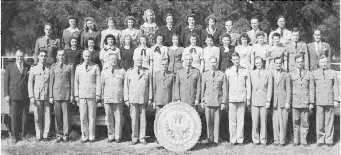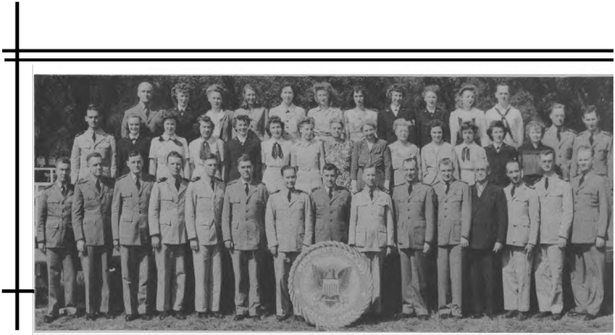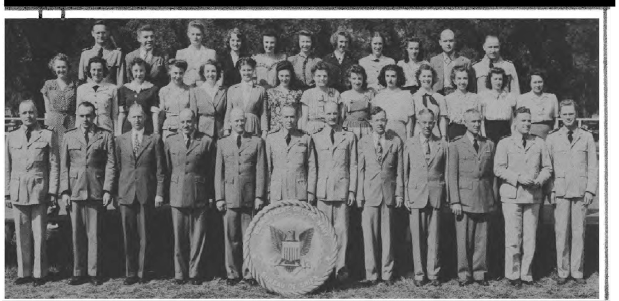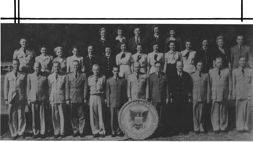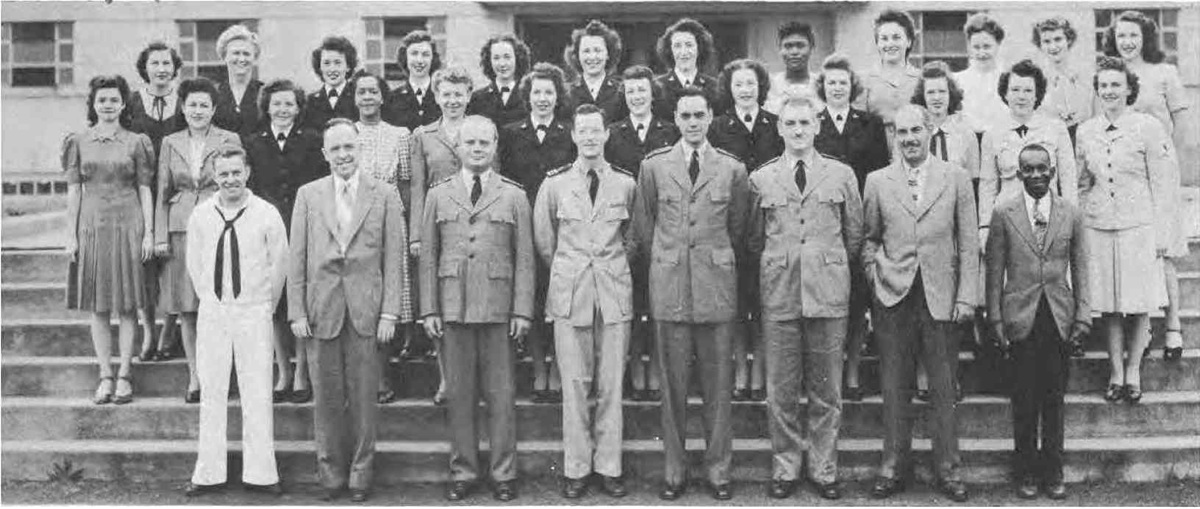 CODES 975, 976, 977, 978, 979 First Row (L. to R.)-Lt. J. H. Broadbent, Lt. C. J. Camp, Lt. M. W. Belsher, Lt. L. A. Ruch, Lt. Cdr. J. C. Walter, Lt. Cdr. J. L. Middlebrooks, Lt. M. E. Powers, Lt. Cdr. L. B. Wheeler, Lt. Cdr. J. A. Heinrich, Lt. C. G. Schucht, Lt. J. L. Richey. Second Row (L. to R.)-L. O'Clery, Lt. G. P. Casper, Lt. C. R. Courtney, K. F. Fisher Y2-c, N. Breeden, T. Balinger, C. A. Pavlides Y2-c, M. E. Thompson Y2-c, E. Peebler, G. Clark, L. Shepperd,_Lt. A. C. V. Diehl, Lt. Col. F. Timmerman, J. M. Stewart, G. R. Sams, W. J. Lee. Third Row (L. to R.)-O. L. Marttn, W. E. Simpson, Lt. H. F. Kane, Lt. M. E. Beard, Lt. V. H. Tonjes, Lt. G. T. DeLaMatyr, CRE G. F. Jacobsen, Lt. D. D. Ritchie, Lt. C. J. Hollis, M. E. Eason, W. A. Ostaff.