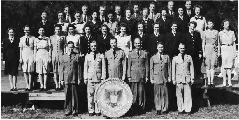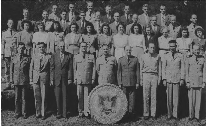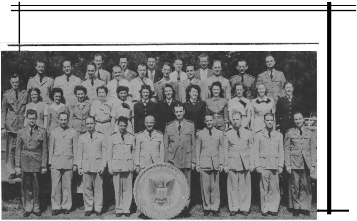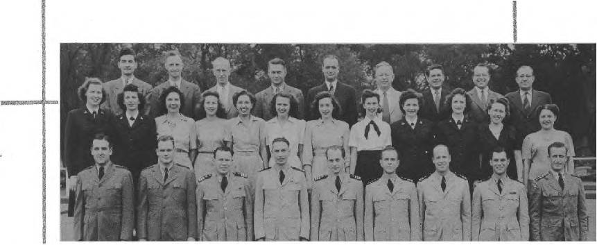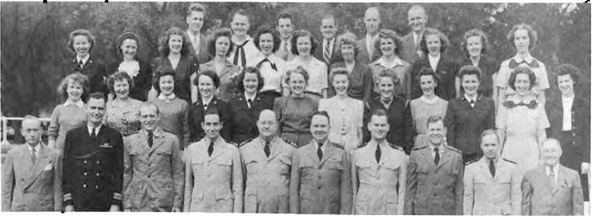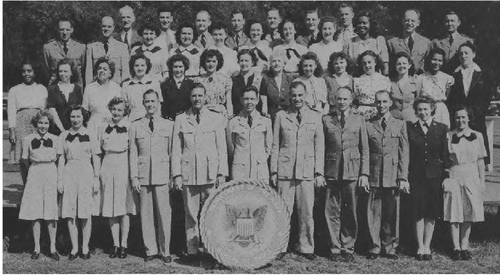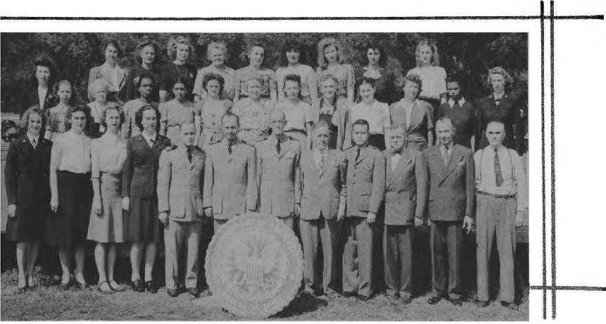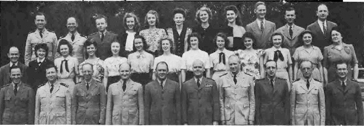 CODES 975, 976, 977, 978, 979 First Row (L. to R.)-Lt. J. H. Broadbent, Lt. C. J. Camp, Lt. M. W. Belsher, Lt. L. A. Ruch, Lt. Cdr. J. C. Walter, Lt. Cdr. J. L. Middlebrooks, Lt. M. E. Powers, Lt. Cdr. L. B. Wheeler, Lt. Cdr. J. A. Heinrich, Lt. C. G. Schucht, Lt. J. L. Richey. Second Row (L. to R.)-L. O'Clery, Lt. G. P. Casper, Lt. C. R. Courtney, K. F. Fisher Y2-c, N. Breeden, T. Balinger, C. A. Pavlides Y2-c, M. E. Thompson Y2-c, E. Peebler, G. Clark, L. Shepperd,_Lt. A. C. V. Diehl, Lt. Col. F. Timmerman, J. M. Stewart, G. R. Sams, W. J. Lee. Third Row (L. to R.)-O. L. Marttn, W. E. Simpson, Lt. H. F. Kane, Lt. M. E. Beard, Lt. V. H. Tonjes, Lt. G. T. DeLaMatyr, CRE G. F. Jacobsen, Lt. D. D. Ritchie, Lt. C. J. Hollis, M. E. Eason, W. A. Ostaff.