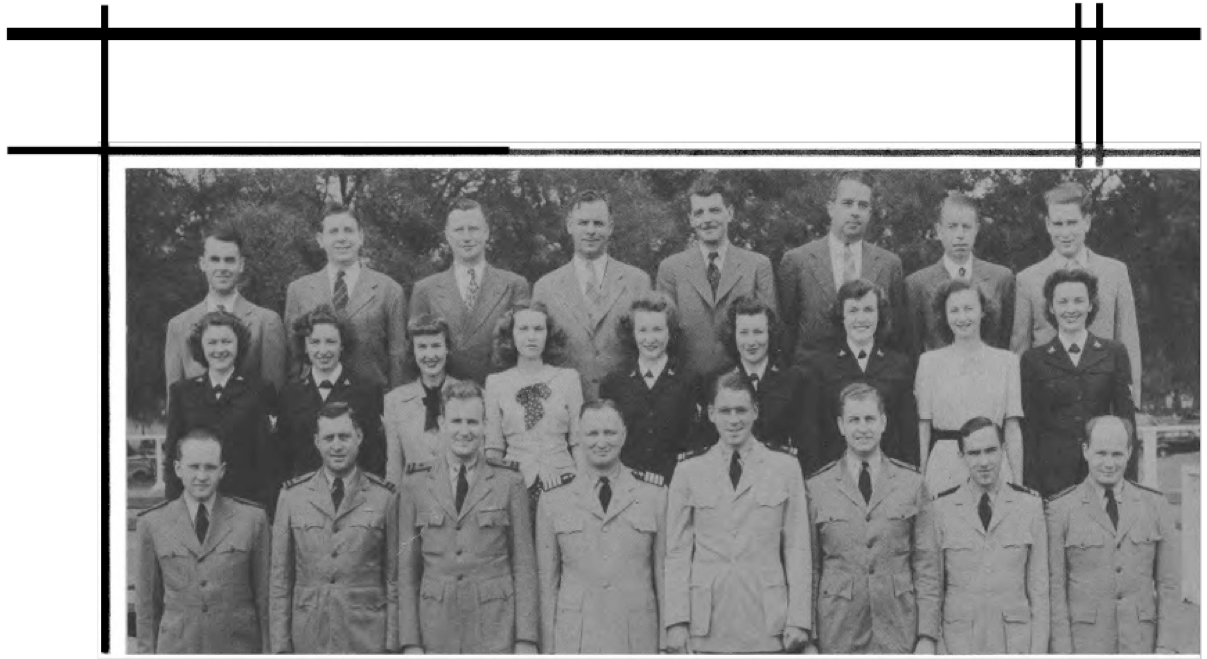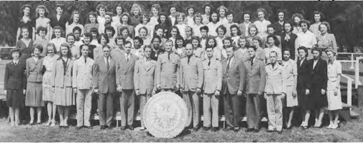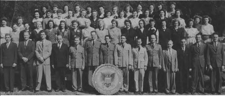 Front Row (L. to R)-A. Warfel Y2·c, L. Mo, E. White, L. Schilling, Lt. L. D. Mc(:ord, B. N. Hastings, J.Fordyce, Elmer Seger, T. W. Taylor (Lr. Cdr.), Lt. C. Paris, Lt. C. Gilfix, J. T. Oliver, Lt. D. W. Hall, Lt. W. J. Schofield, D. Johnson, V. Perrygo, H. Strohkarch, V. Bowden. Second Row (L. to R)-M. Stephens, L. Olson, B. Eddy, A. Honabach, D. Johnson, S. Martin, B. J. Read, F. Owens, M. T. Russ, M. B. Rornem, A. Elavsky, B. Beam, B. Adams. Third Row (L to R)-S. Besant, C. Sperduto, S. Harris, J. Williams, L. Reinmuth, M. Dues, M. Mink, G. Beach, P. Harris, B. Robert, C. Akin, H. Walker, E. Salo, R. Burnham, D. Masters, A. Duff, R. Parkin, M. Felton, M. ShulL. Fourth Row (L. to R.)- O. Maddox, J. Harper, R. Cloud, F. Richards, M. Dorsey, C. Braun, C. Barr, V. Slatton, H. Doerr, L. LaFave, M. Nichols, M.A. Wright, F. Shepherd, J. Bell, F. Ballard, V. Milhon, P. Lepley, S. Coder. Fifth Row (L. to R)-G. Kron, B. Fowier, L. Moller, G. Dowdy, M. Alter, L. Diekmeier, J. Kirchoff, M. J. Carter.