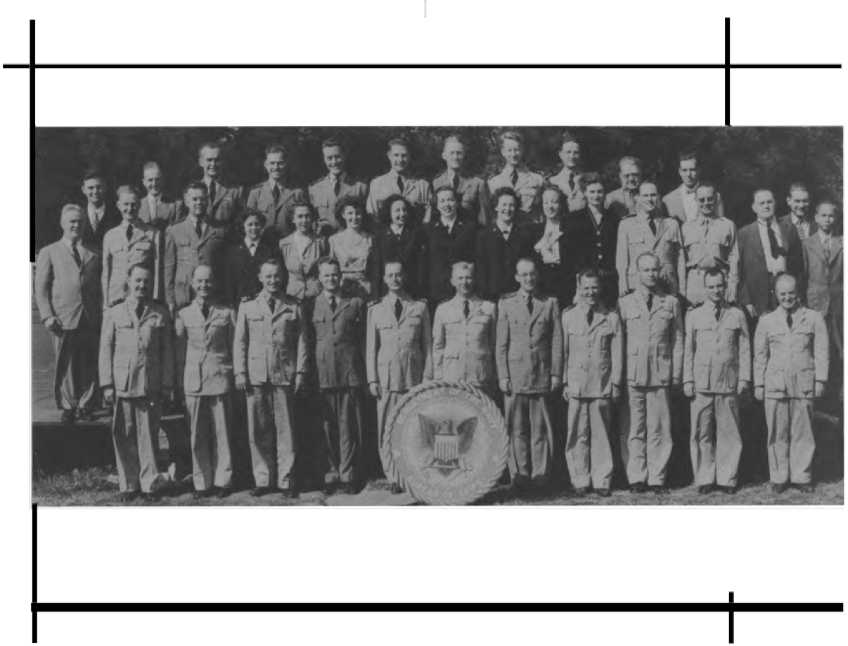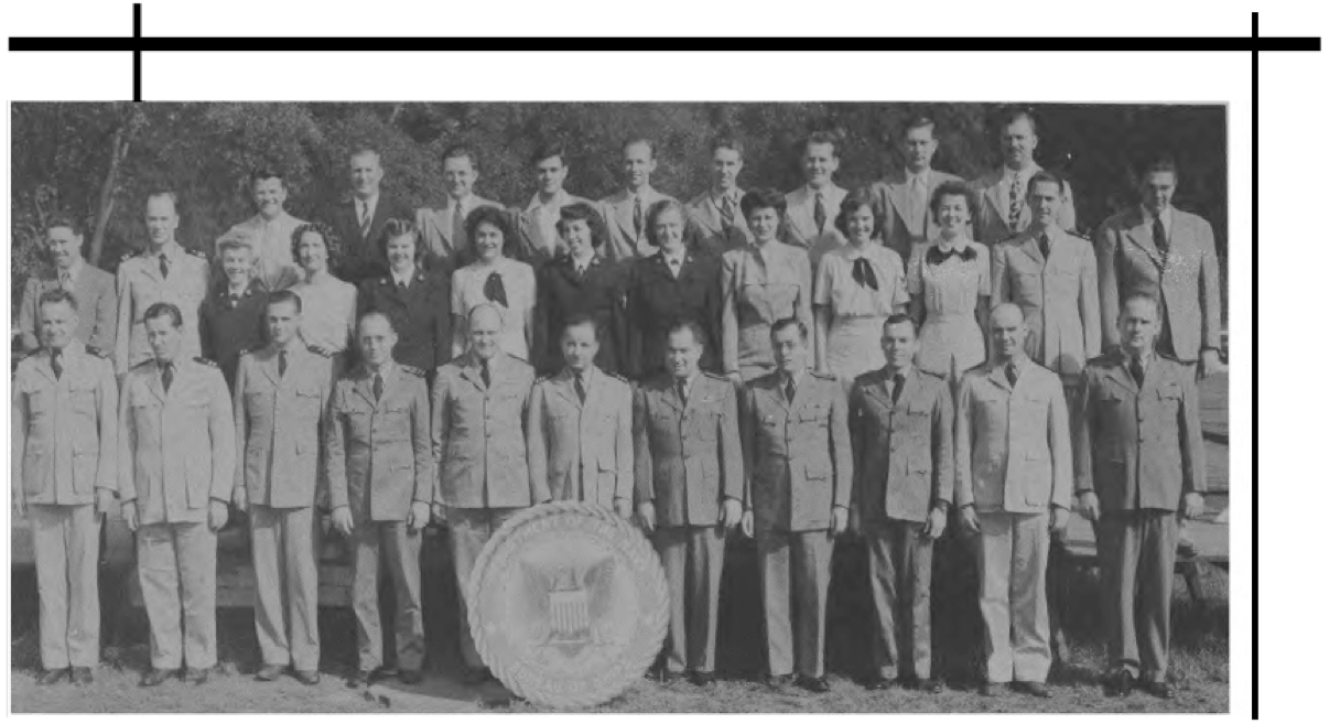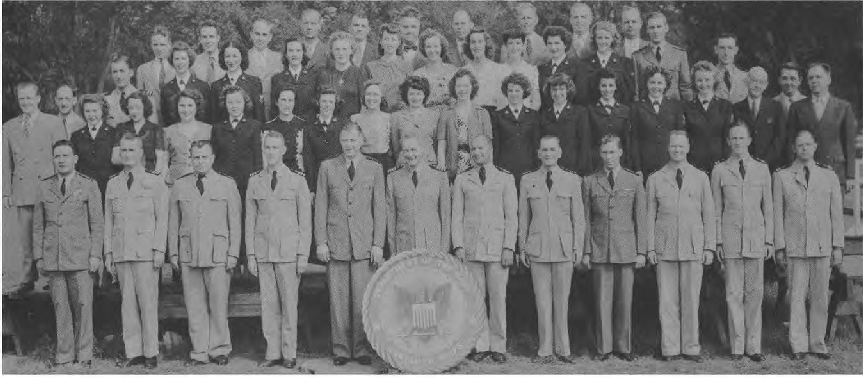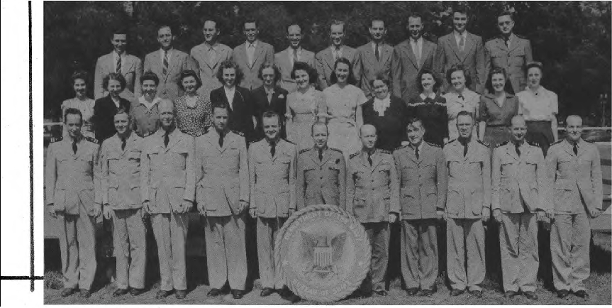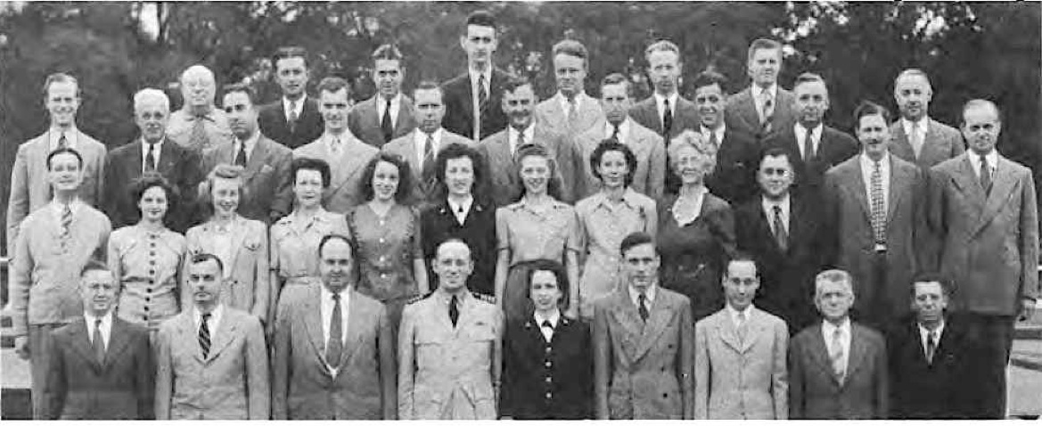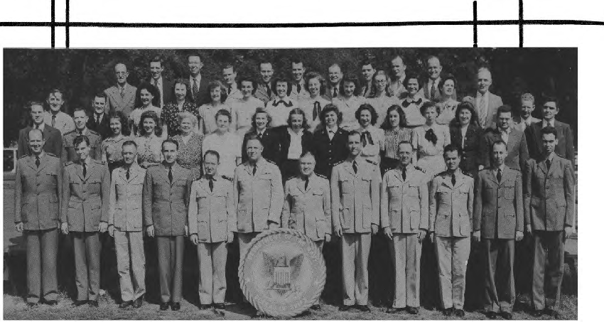 Front Row (L. to R.)—Lt. Cdr. J. G. Holland, 1st Lt. E. V. Roberts, CRE W. J. Breuer, Lt. E. A. Fredholm, Capt. R. P. Houlihan, Lt. Col. F. A. Ramsey Jr., Maj. H. C. Lattimer, Lt. Cdr. C. H. Reiter, 1st Lt. W. W. Smith, Maj. H. C. Hazel, Lt. E. D. Sweeney. Second Row (L. to R.)—A. Schmidt Y3-c, F. O'Brien Y2-c, A. Bowes Y1-c, R. V. Culhane Y3-c, A. Planishek, S. Skwarto, M. A. Rantapaa, 1st Lt. C. T. Rauch, H. Livengood, J. E. Slimak, E. R. Berry. Third Row (L. to R.)—Capt. C. E. Johnson, 1st Lt. C. L. Parody, Lt. J. F. Ryder, Lt. C. M. Leeds, Lt. Col. E. F. Wann Jr., Capt. M.S. Adams, Capt. L. H. Howe, Capt. J. H. Leveque, Lt. B. M. Gallaher. Fourth Row (L. to R.)—A. P. Massey, P. A. Lain, C. F. Elwell, F. Gluck, W. Shaup, J. M. Glass, I. L. Mattson.