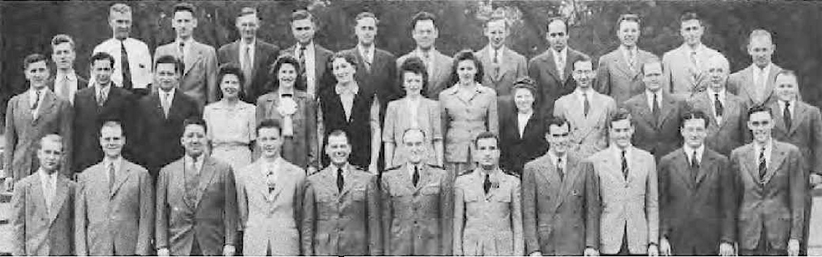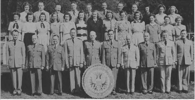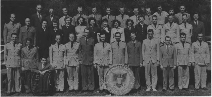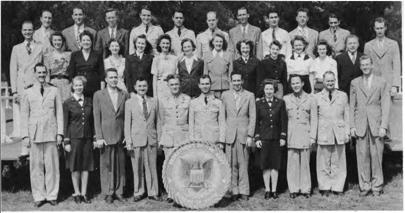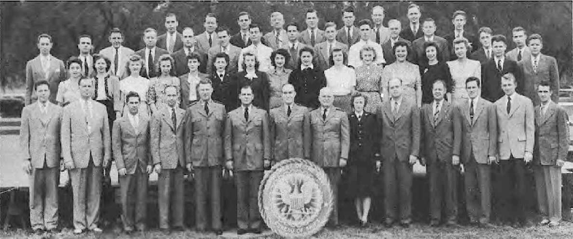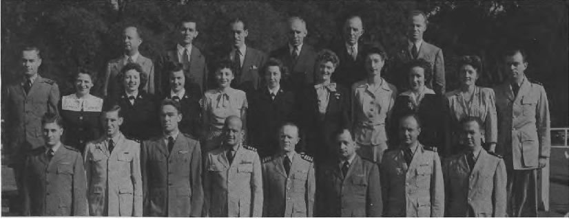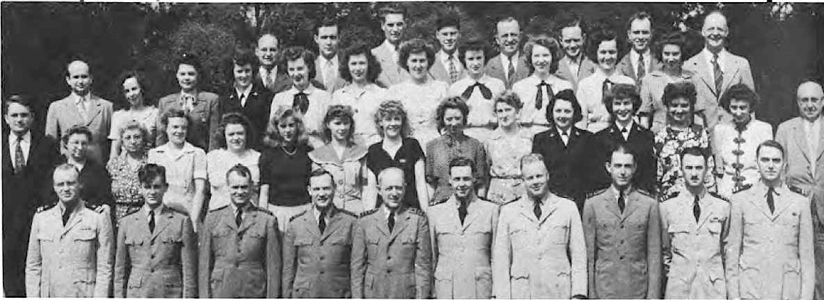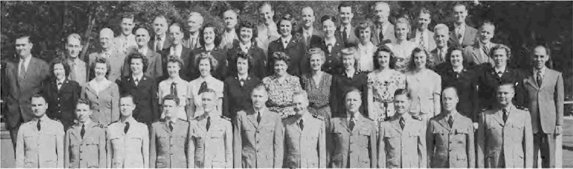 Front Row (L. to R.)—Lt. Cdr. J. G. Holland, 1st Lt. E. V. Roberts, CRE W. J. Breuer, Lt. E. A. Fredholm, Capt. R. P. Houlihan, Lt. Col. F. A. Ramsey Jr., Maj. H. C. Lattimer, Lt. Cdr. C. H. Reiter, 1st Lt. W. W. Smith, Maj. H. C. Hazel, Lt. E. D. Sweeney. Second Row (L. to R.)—A. Schmidt Y3-c, F. O'Brien Y2-c, A. Bowes Y1-c, R. V. Culhane Y3-c, A. Planishek, S. Skwarto, M. A. Rantapaa, 1st Lt. C. T. Rauch, H. Livengood, J. E. Slimak, E. R. Berry. Third Row (L. to R.)—Capt. C. E. Johnson, 1st Lt. C. L. Parody, Lt. J. F. Ryder, Lt. C. M. Leeds, Lt. Col. E. F. Wann Jr., Capt. M.S. Adams, Capt. L. H. Howe, Capt. J. H. Leveque, Lt. B. M. Gallaher. Fourth Row (L. to R.)—A. P. Massey, P. A. Lain, C. F. Elwell, F. Gluck, W. Shaup, J. M. Glass, I. L. Mattson.