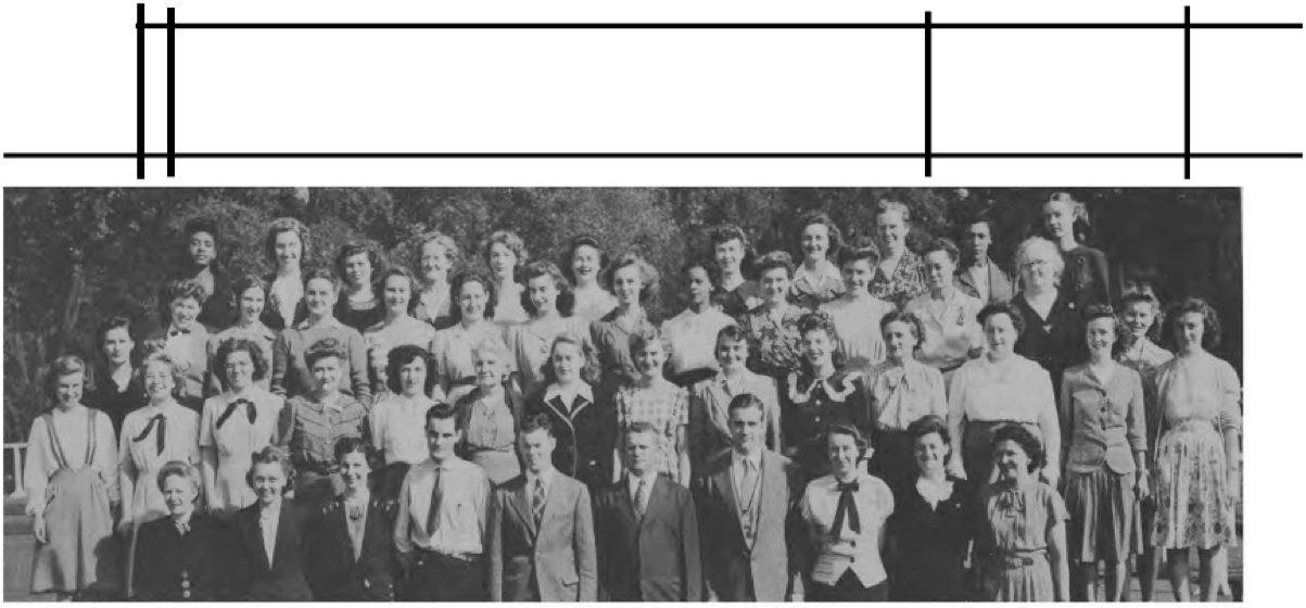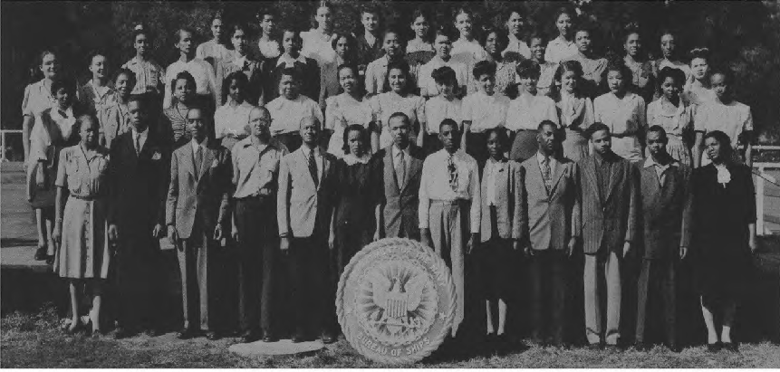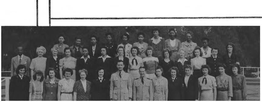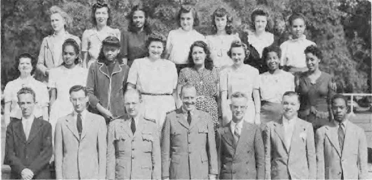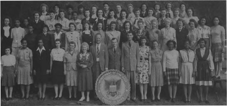 CODES 231, 232 First Row (L. to R.)--J. Reynolds (maybe George J. Reynolds), M. Anderson, N. Thomas, V. Johnson, j. D. Pettis, J. E. Fisher, F. Porter, L. J. Syphax, D Parker, P. Scott, J. Foster, J. White. Second Row (L. to R.)--D. Robinson, E. White, E. C. Jenifer, J. M. Cooper, I. Reese, P Pleasant, L. B. Johnson, M. Ford, G. Williams, H. Shepherd, O. Kenney, I. G. Tyler (maybe Annie G. Tyler), M. V. Lee (Viola M. Lee), S. Ward, B. Hawkins, R. Lytle, M. Henderson, M. L. Fulwood. Third Row (L. to R.)--J. Goldie, E. Pettyjohn, A. Rollins, G. Evans, A. Turner, T. Freeman, E. Gibson, Nellie M. Odellas, C. Morris, M. Sawyer, E. Flemmings, E. Carpenter, M. Simon, D. Berger, Edna L. Conway, L. Whiting Fourth Row (L. to R.)-L. Evans, Z. O’Neal, V. G. R. Wilson, L. Clark, G. Cherry, M. Weaver, D. Kelly, B. Simmons, I. Ford. D Jeffries, A. Good, E. Jones, I. Robinson, M. Culberson, A. Snowden (maybe Martha A. Snowden Wilson), Lizzie Mae Diuguid (born 1920, married James Wesly Jones on January 17, 1946 in Lynchburg, VA, father: Walter Diuguid, mother: Nettie K. Harvey). Fifth Row (L. to R.)-F. Dent, E. Hayes, F. Ficklin, M. E. Sullivan, B. Timberlake, L. Young, A. Dalton, S. Russell, C. Bradley.