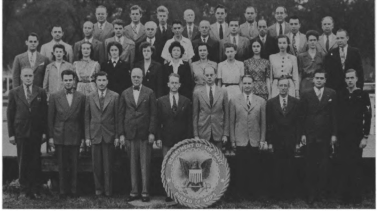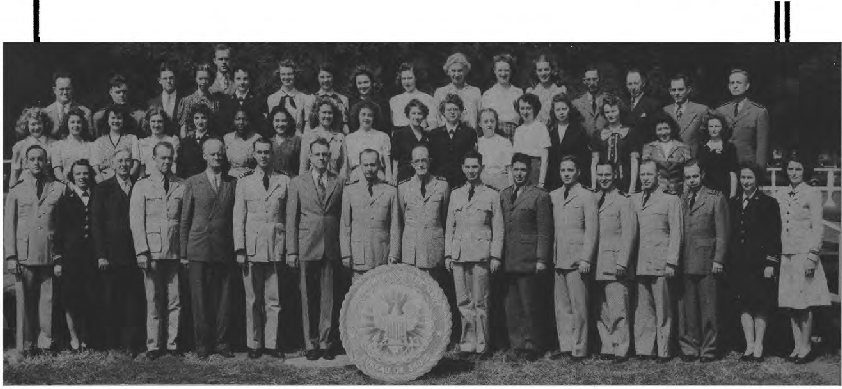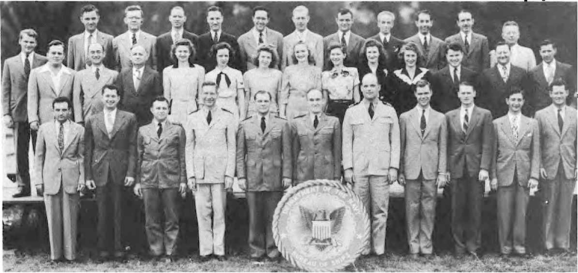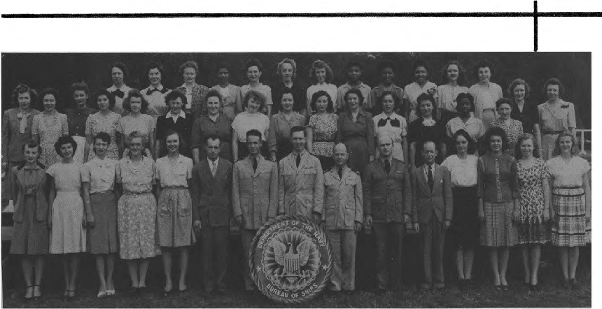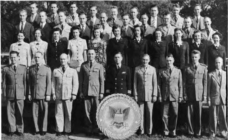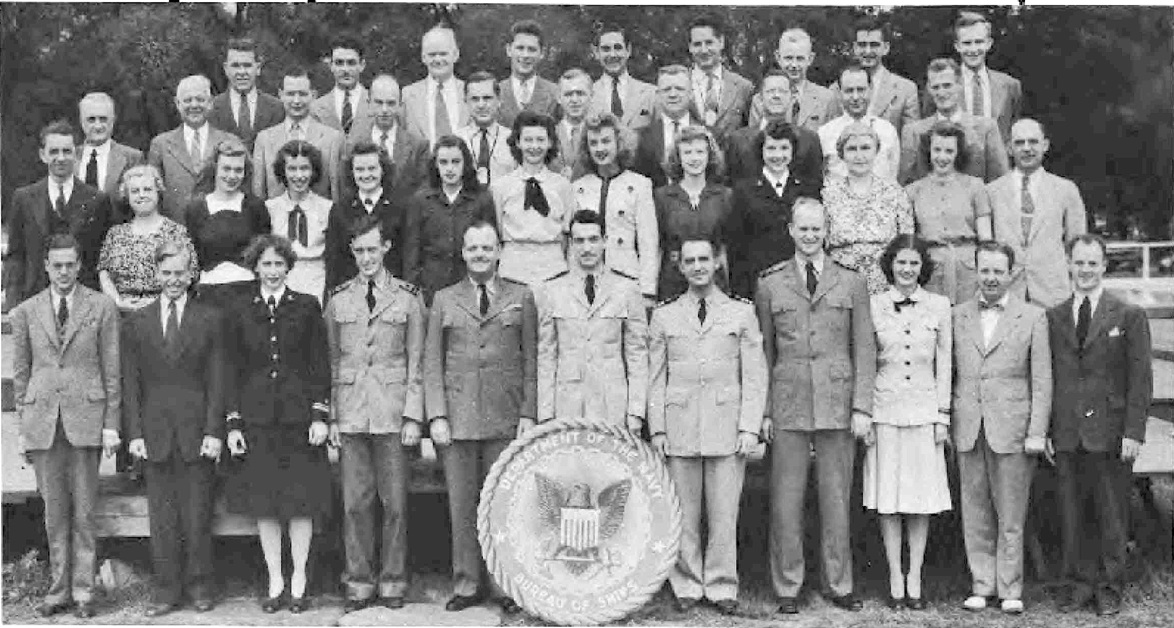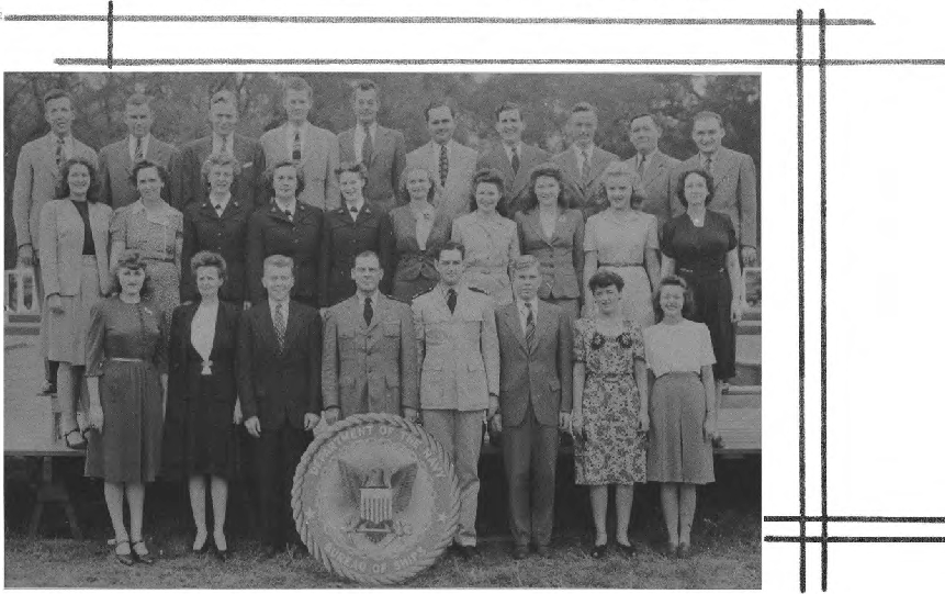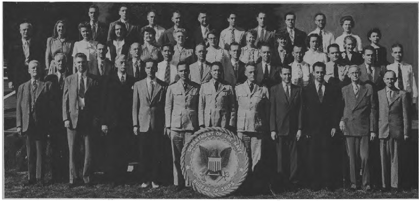 First Row (L. to R)-T. M. Hemphill, E. H. Westerfield, A. B. Czachurski, J. J. Doherty, Lt. Cdr. P. S. Johnson, Capt. W. C. Wagner, Lt. Cdr. W. R. Fuller, Lt. Cdr. J. W. McCloskey, S. E. McCrary, Lt. J. A. Lyon, Lt. (jg) D. M. Fleming, G. C. Harding. Second Row (L. toR. )-A. Cuervo, B. Mitchell, F. Robinson, L. Qutermous, L. Teller, D. Sterling, L. Lowther, M. Harris, T. Rubenstein, M. Gangelhoff, W. Turner, E. Fones, M. B. Corrick, M. McGarry, L. Jackson. Third Row (L. to R.)-Lt. R. G. Mueller, Lt. (jg) V. F. Saitta, M. Henoch, M. A. Ford, P. M. Terlizzi, Lt. H. C. Roberts, Lt. S. F. Wilbur, J. B. Alfers, L. E. Sieffert, P. A. Klinkert, A. L. VanEmden, E. F. Seaman.