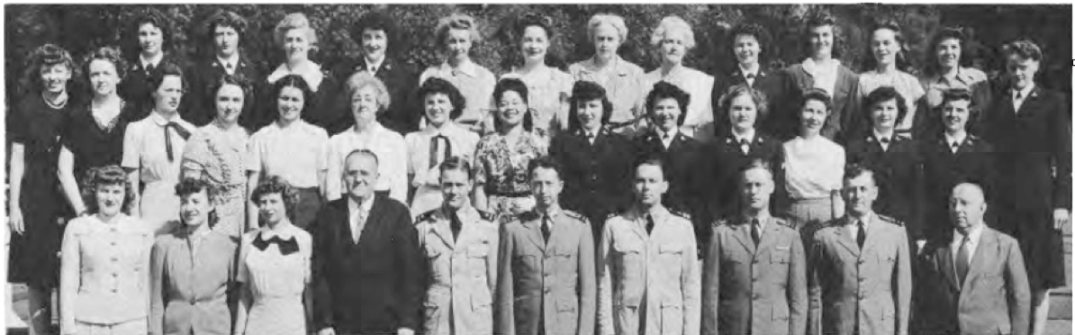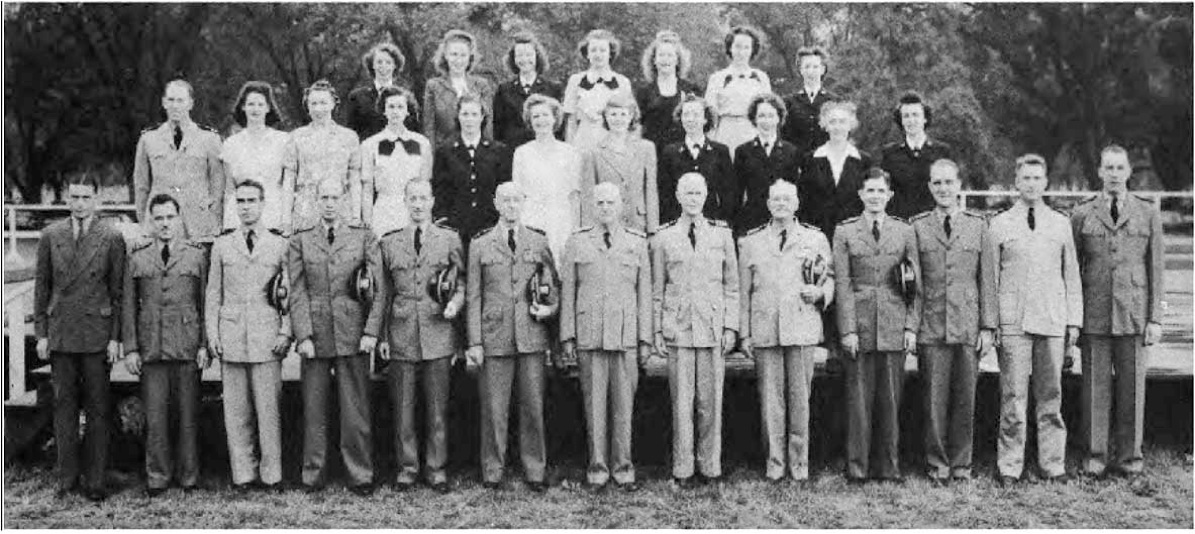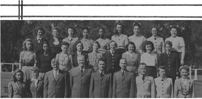Front Row (L. to R.)-M. Salerno, H. Taltavull, L. Butts, R. Cross, Cap. E. T. Aldridge, Cap. P. G. Lauman, Lt. V. V. Peters, P. Gleason, W. Devine, A. J. G. Babel, Second Row (L. to R.)-E. Odell, R. Feldman, E. Rhame, L. Tmcher, M. Lancaster, E. Gorman, E. McLain, L. Debiasi, G. Hughes, M. Foster, M. Kelley, M. Johnson. Third Row (L. t.o R.)-M. VanLoon, R. Mulany, A. Steffen, K. Dawson, M. Woodruff, E. Devine, H. Lawson, V. Bennett, D. Halverson, F. Dandridge, N. Soger.