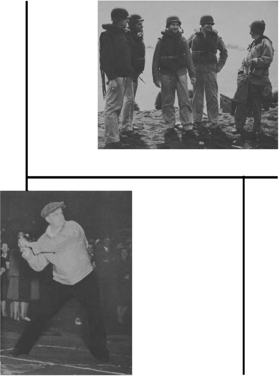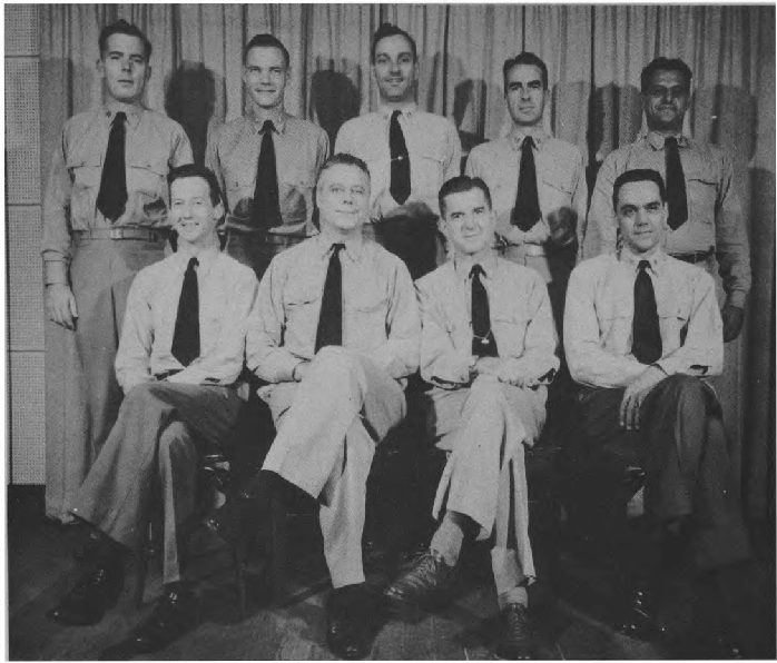 Front Row (L. to R.)—W. W. Brantley, Sgt. A. Kinge, D. C. Rooney, E. J. Nucci, Lt. (jg) D. F. Colburn, Lt. (jg) H. C. Bailey, Lt. (jg) J. W. Trumbo, Ens. J. L. Flanagan, B. C. Paganelli, J. Sacks, M. S. Rossheim,