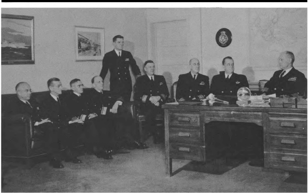 *R. Adm. L. Denfeld, CoL. V. V. Whitney, Sec. Navy James V. Forrestal, R. Adm. Mills, Lt. Gen. Holland Smith