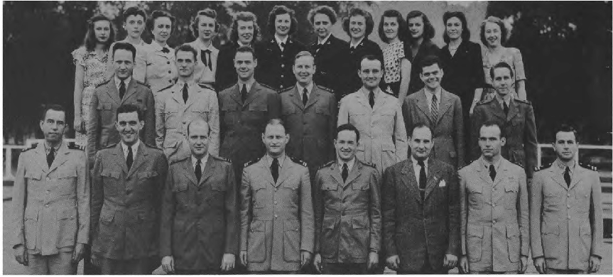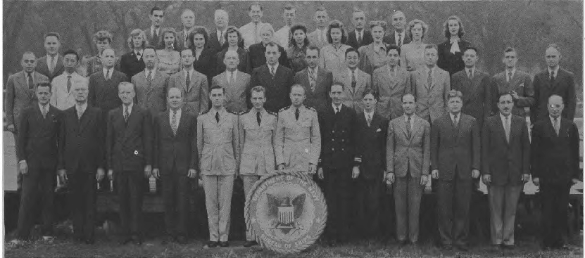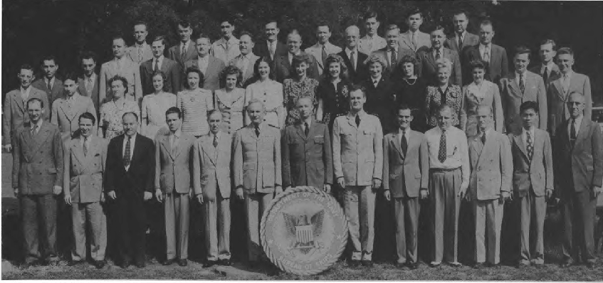 Front Row (L. to R.)—Lt. W. J. Fleig, Lt. M. I. Lapp, Cdr. J. C. Myers, Cdr. Roger Revelle, Lt. Cdr. C. L. D. Allen, Lt. M. Sargent, Lt. C. Charski. Second Row (L. to R.)—Ens. J. Gallo, M. Scher Y3-c, B. Hood, R. M. Cleary, C. Edge, F. E. Chromulak Y3-c, D. Blum Y3-c, E. Bach, C. Reiser, L. Ayer, M. Butler, Ens. V. D. Schmid. Third Row (L. to R.)—I. Allen, S. Lefkor, E. Campton, J. Aitchison, C. Rischer, P. Russell, W. T. Grumbly, Dr. R. F. Humphreys, Dr. Edward Gerjuoy. Fourth Row (L. to R.)—Dr. Lyman Spitzer Jr., Dr. A. Wikstrom, H. Abbey.