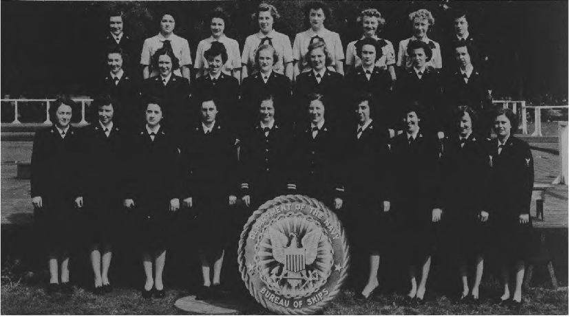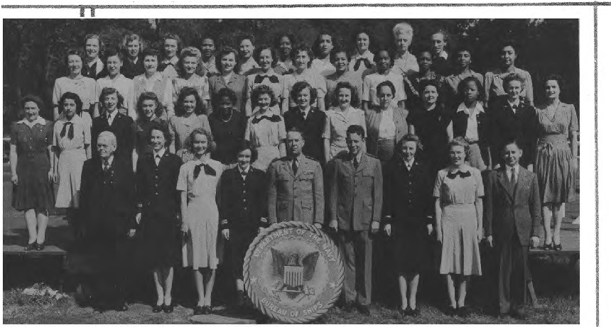 Front Row (L. to R.)—E. B. Jackson, A. B. Simpson, A. M. Jenkins, R. E. Katen, M. E. Lentz, B. M. Sweet, L. T. Harrison, Lt. W. P. Curtiss Jr., Lt. C. B. Cornelius, M. L. Castile, H. R. Hale, R. Jones, A. M. Dinkins, B. D. Nicholson. Second Row (L. to R.)—V. M. Sullivan, N. Evans, N. Lee, M. B. Snedeker Y3-c, B. Gladden, E. H. McFadden Y2-c, M. Mayberry, K. Chamberlain, M. Conniff, R. Newmark S1-c, Rhea Smiley, E. Peterson, M. Marrs, D. Bauer Y2-c, H. Bearr, M. Robinson, B. Harris. Third Row (L. to R.)—J. Stanford, D. Grossini Y3-c, E. S. Wagner, K. Worsham, D. Brown, J. A. Johnson, R. A. Apple, M. C. Joyner, E. L. Brandimarte, L. Whitney Y3-c, M. E. Mcintyre, E. Morley, E. Shreve, E. Lain. Fourth Row (L. to R.)—D. Lusher SK3-c, E. Gumee Y3-c, L, Smith, V. Coates, D. Mapston, G. Goins, R. Murphy, E. Kirk, H. Thompson, D. Roth, J. Stockwell Y1-c, W. Marchant.