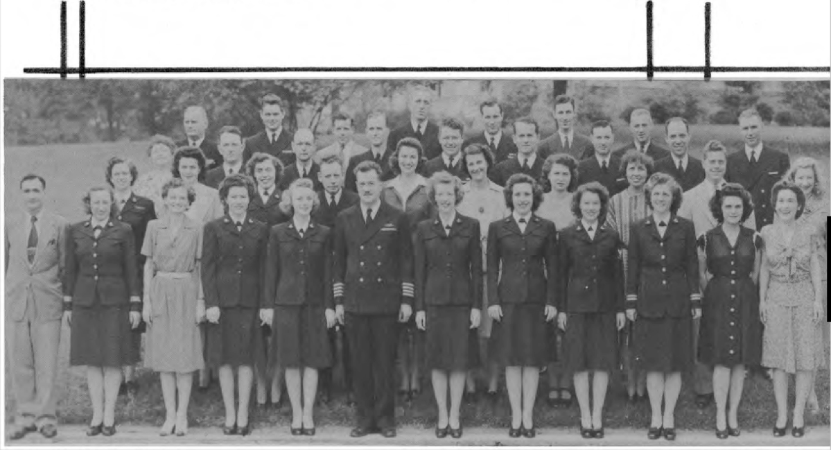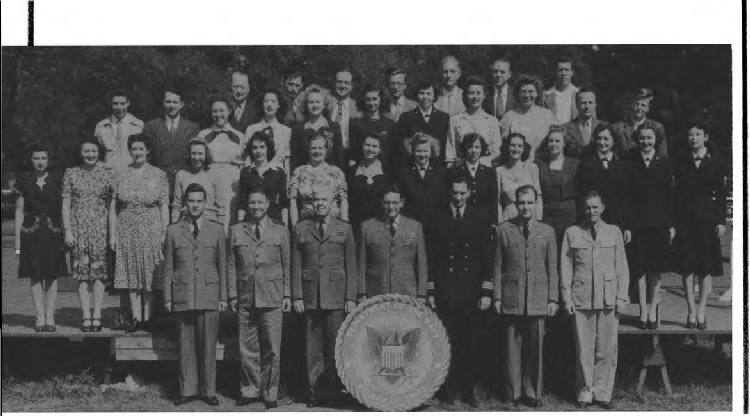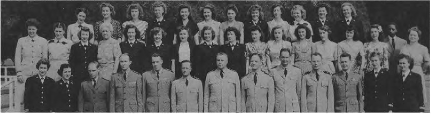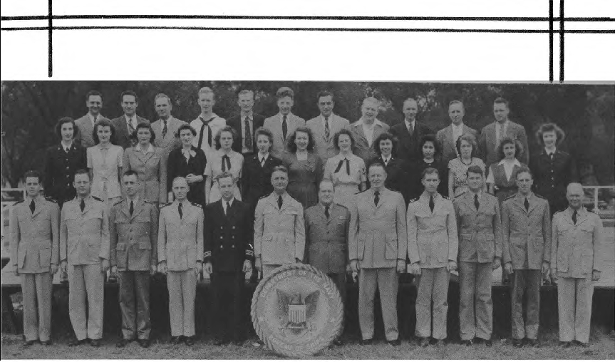 Front Row (L. to R.)—Ens. J. C. Miller, Lt. (jg) E. J. Bjorman, Lt. I. W. Wright, Lt. R. W. Rogers, Lt. W. M. Powell, Lt. Cdr. J. K. Stewart, Cdr. H. E. Thomas, Lt. J. Colhkoff, Lt. C. C. Ijams, Lt. (jg) E. R. Schuler Lt. R. H. Fleming, Ens J. B. Robbins, Lt (jg) A. E. Pignatiello. Second Row (L. to R.)—Ens. A. Robbins, D. Duffy Y3-c, E. D. Monahan Y3-c, L. Ailey, C. Housenfluck, J. S. Thompson, L. Harris, D. Rosner Sp(X)1-c, M. L. Emerson, A. M. Bazan, L. Wilkinson, M. Crosby S1-c, N. Phaneuf Sp(X) 1-c, L. Mtsemer, M. Lee, E. Serepuk. Third Row (L. to R.)—Lt. J. W. Jacobs, Lt. E. M. Grout, Lt. (jg) C. Haynes, Lt. A. L. Vogan, P. G. Mogen, M. Cox Y3-c, D. Searfoss Sp(X)3-c, E. Roberts, N. F. Nazare, G. Green, O. P. Carmi. Fourth Row (L. to R.)—L E Morrisey, L.A. Meadows, J.D. Arnold, G. Lieverman, C. N. Williamson, H. L. Chadbourne, M.A. Rauh.