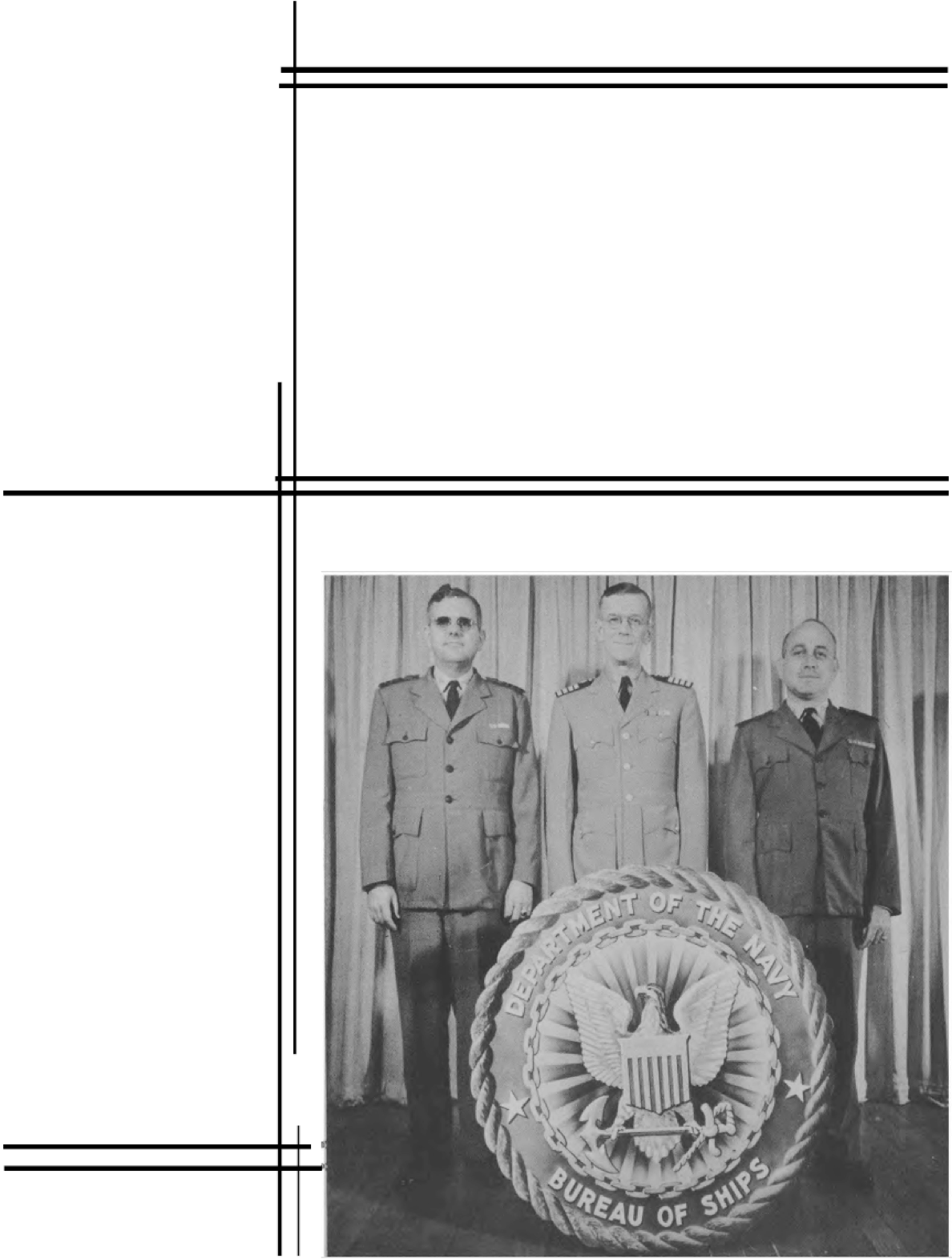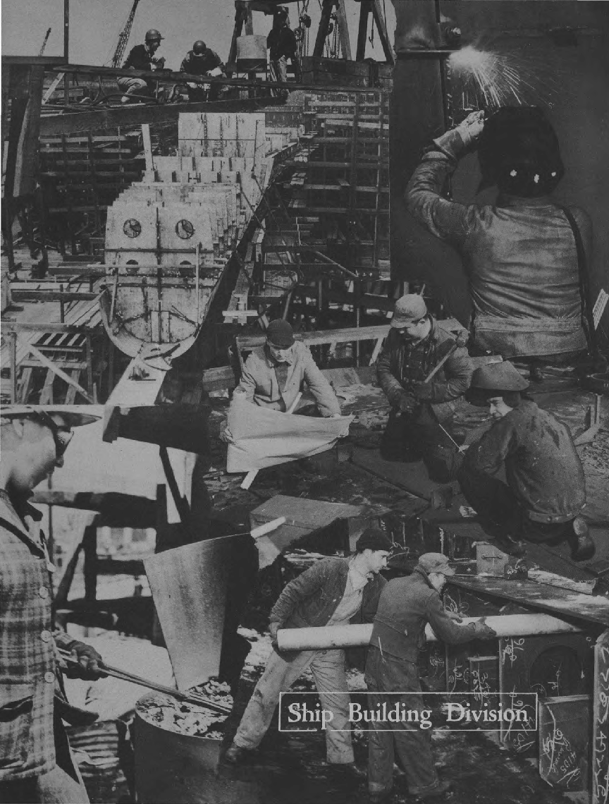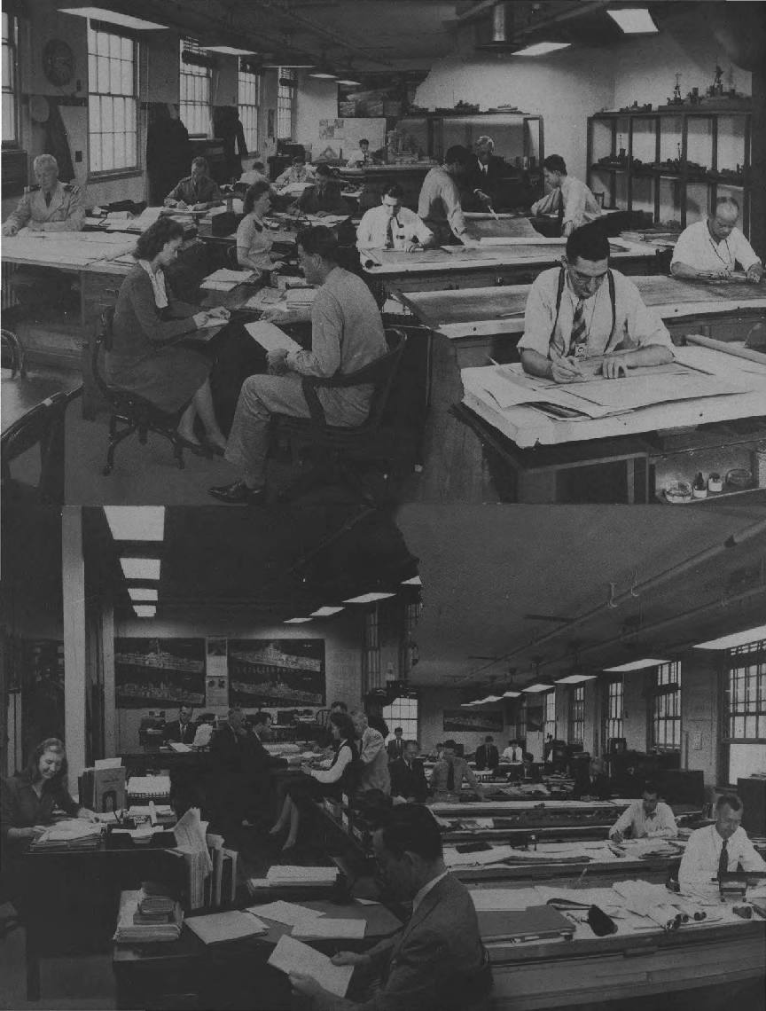 This yearbook represents a pictorial record of part of the story of those years in terms of the great behind-the-lines battle for production that went on day after day and night after night in the Bureau of Ships, home office of the Navy's marine architects and engineers, production men and technicians, researchers and radio specialists. The story of the Bureau is the story of the drawing together, into one extraordinary production team, shipbuilders and industrialists, scientists and statisticians, administrators and artisans to the end that America would have a navy to strike fear in the hearts of any possible combination of enemies.