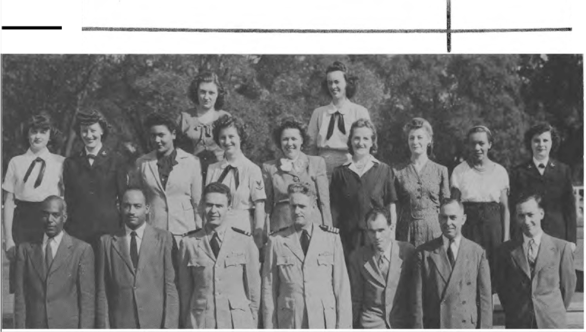 First Row (L. to R.)-M. Heflin, N. S. Benton, J B. Lunsford, Cdr. V. E Mallory, Cdr. J. C. Radford, Cdr. R. B. Jones, Lt. O. Otteson. Lt. (jg) K. M. O'Fallon, A. Mater. Second Row (L to R.)-P. Kinney, C. Dennis, T. Bernfeld, K. Brunswick Y2-c, L. Dittmann, Ens. M. J Bloom, J. MacGregor, F. M. Green, Lt. N. B. Long. Third Row (L. to R.)-M. E. Vance Y2-c, M. L. Houghten, R. Engel, T. Davis, I. M. Miller, N. H Heathcote, M. Feece, Ens. J. L. Keen, B. Wright.
