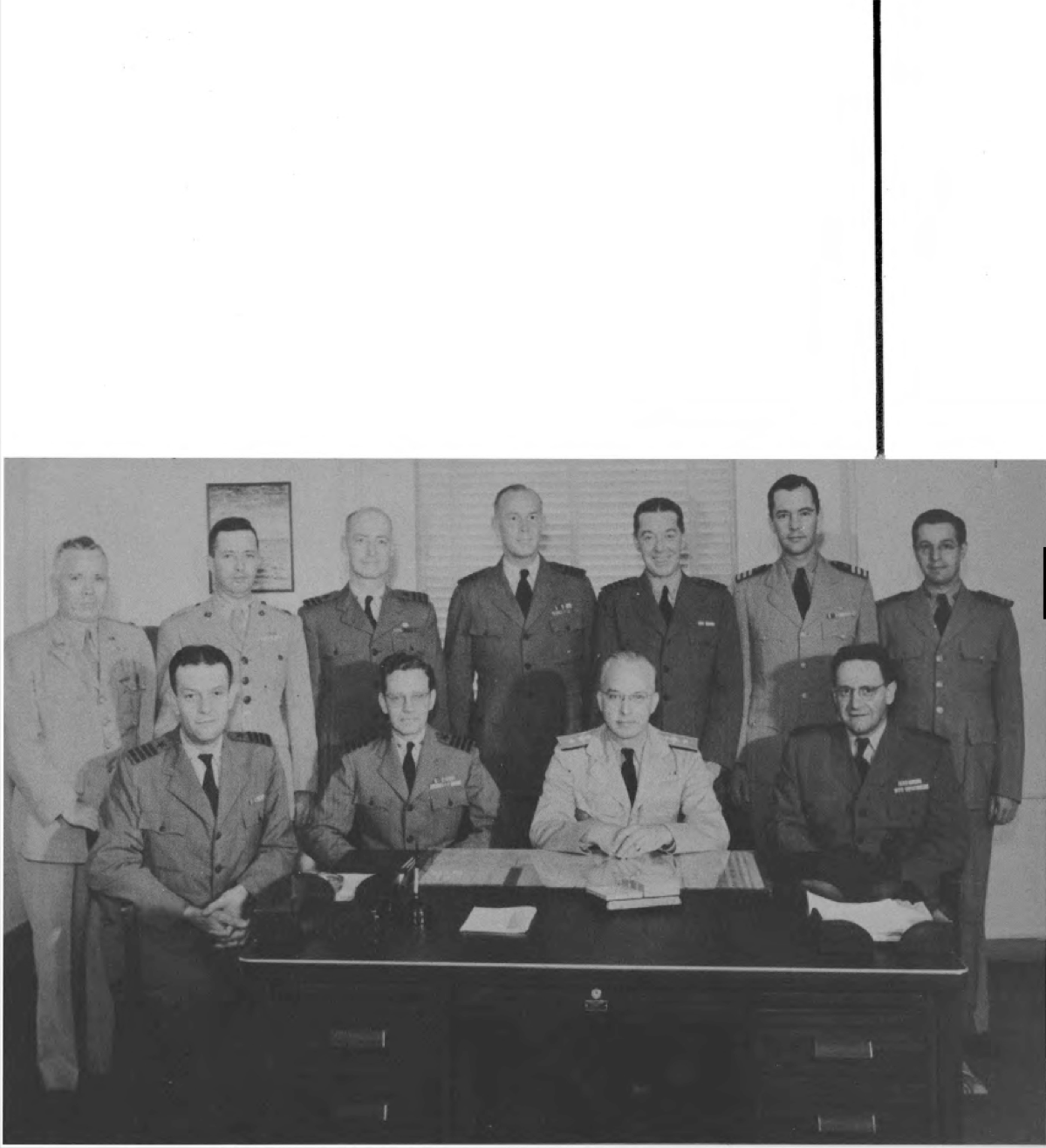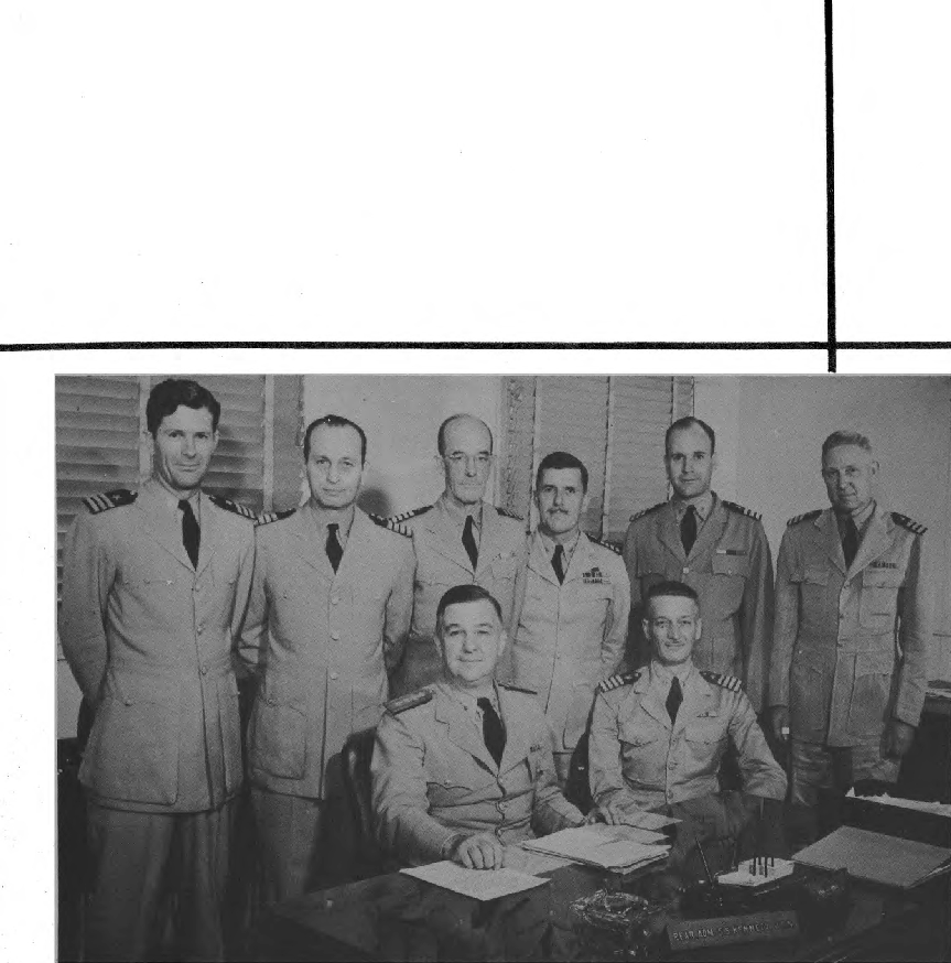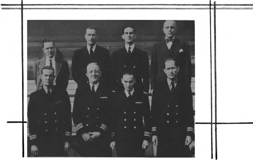First Row (L to R.)-Cdr. C. H. Campbell, Capt. R. F. Yager, Capt. E. E. Roth, Lt. Cdr. Charles Edward Clutts. Second Row (L to R.) Lt. C. A. Howe, Lt. Cdr. T. W. Taylor, Lt. E. Stanton, Lt. J. S. Thomas, Lt. Kenneth Shaftan.