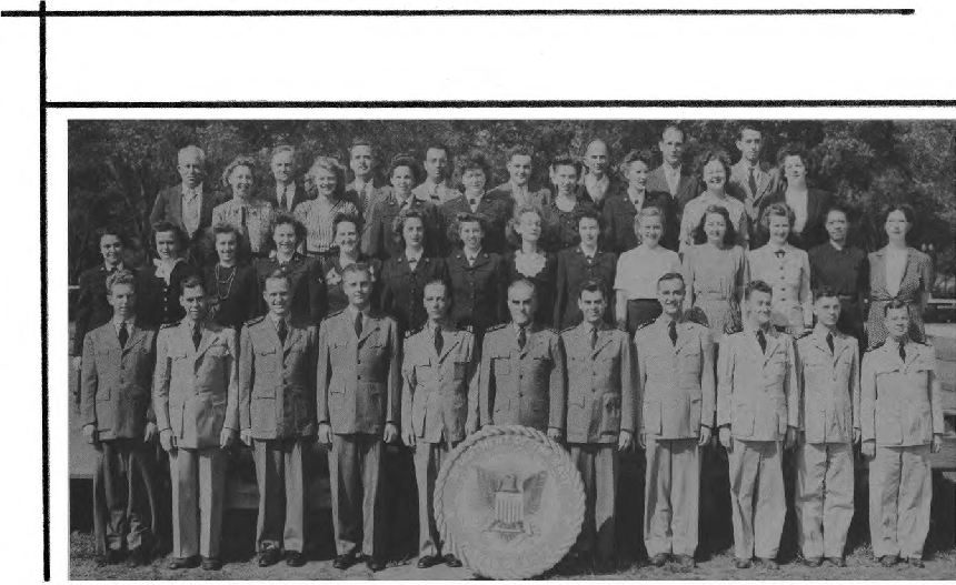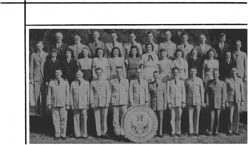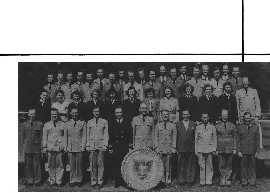 First:Row .(L. to R.)-Lt. J. H. Thompson, Lt. K. Wall, Lt. T. M. Johnston, Lt. Cdr. C. W. Hammett, Cdr. G. C. Norwood, Capt. J. W. Gu1der, Lt. Cdr. J. S. Kaufmann, Lt. J. F. Galv1n, Lt. S. D1mond, Ens. V. J. Ford, Lt. Cdr. H. C. Briggs. Second Row (L.to R.)-E. M. Chatterton Y3-c, S. Pasat Y2-c, M. J . Pratt.Y2-c, C. T. Davis Y2-c, M. Wolke, R. Steinberg Y2-c, B. Belott Y2-c, M. T. Webb, M. Kress, M. V. Gdpm, M. Goodson Y3-c, M. Eb1e Y2·c, K. Lund SI-c, I. Koski Y3-c1 B. M. Jones Y3-c. Third Row (L. to RJ-Lt. C. Allen, Lt. W. P. Davison, R. Loveday YI-c, M. L. Ladendorf Y2-c, M. McDowell, D. V. Sturtevant Y3-c, A. Carson Y3-c, L. Smith Yl-c, J.P. Beaver, Lt. A. H. Hammann, Lt. M. R. Stoecker. Fourth Row (L. to R.)-Lt. (jg) M. R. Long, I. B. Potter, Lt. H. Gabrilove, Lt. A. G. Montgomery, Lt. (jg) R. J. Beeman, J. F. Thompson.