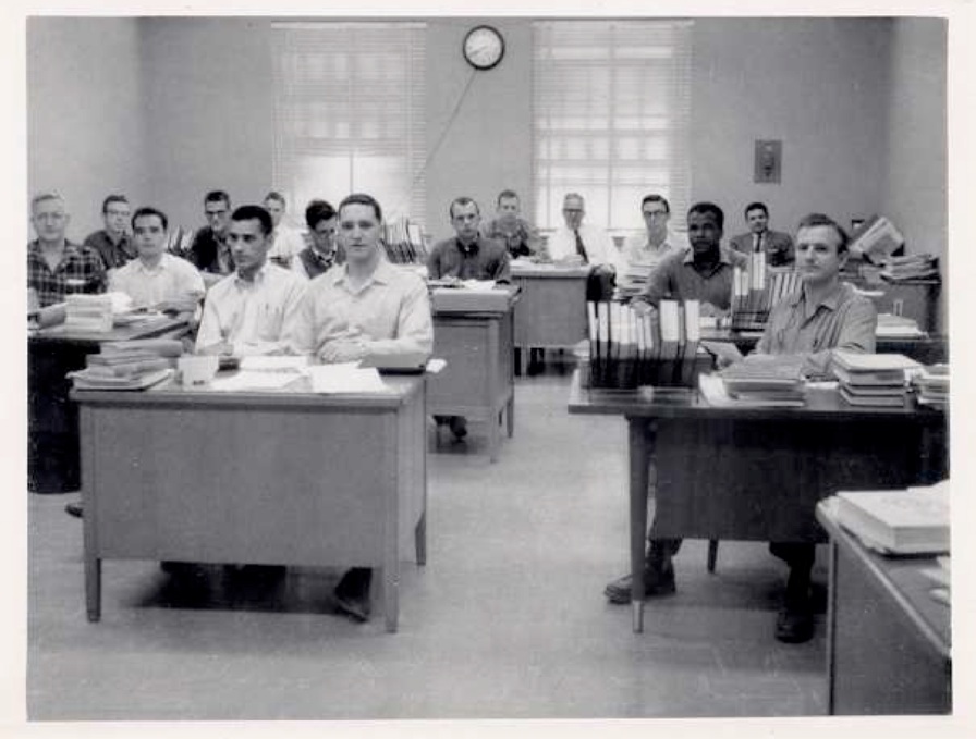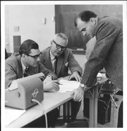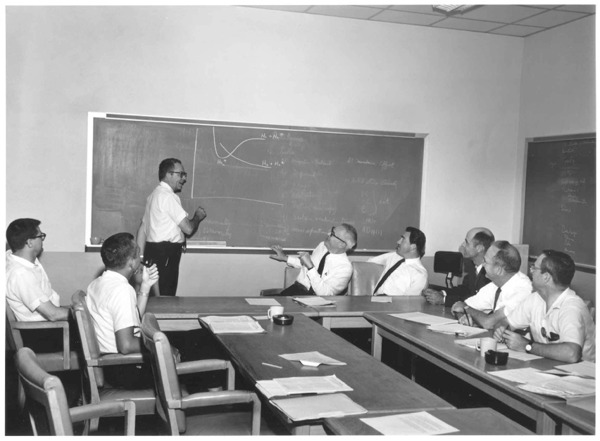 Dr. Joe Louis Franklin (at board), Exxon and later Rice University and Professor Frederick Albert Matsen (seated in the middle) consulting with Exxon research staff. Matsen was a consultant for Exxon Houston and New Jersey for 40 years. Please send any other identifications. One of his projects was to participate in the design of a coal-liquifaction unit. |