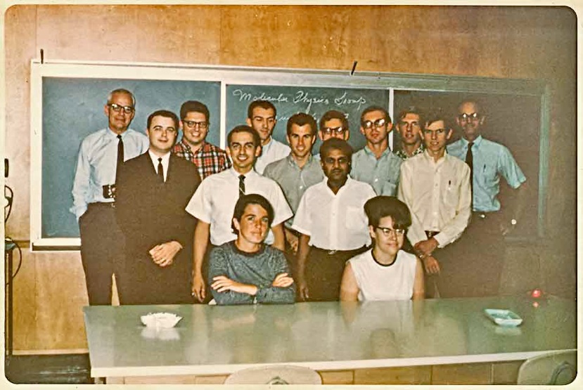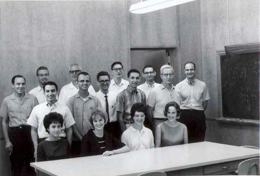 August 11, 1964, Rm 204, Chemistry Bldg. L eft to Right Back Row: Charles Carlisle, Ronald D. “Ron” Poshusta, Matsen, Don Scott (post-doctoral student, PhD with Ralph S. Becker, U. Houston), Bill Plummer, M. Lawrence “Larry” Ellezy. Middle Row: Antonio A “Tony” Cantu (U. S. Secret Service), Conrad Hinckley (PhD with Tom Morgan, later became Professor at Southern Illinois U.), Donald Zetik, Ed Rodriguez, Angus Pearson Front Row: Charlyne Cooper (Sec.), Brenda Patterson (Sec.), Judy Hempel (did PhD with Tom Morgan), Patricia Moore (later married Bill Plummer). (Larry Ellezy and Tony Cantu kindly provided these identifications. Tony took picture with tripod) |