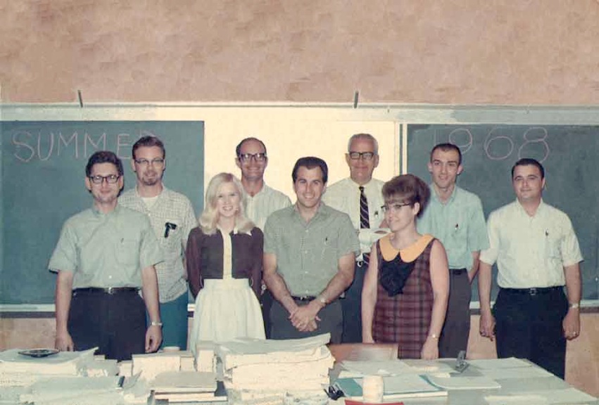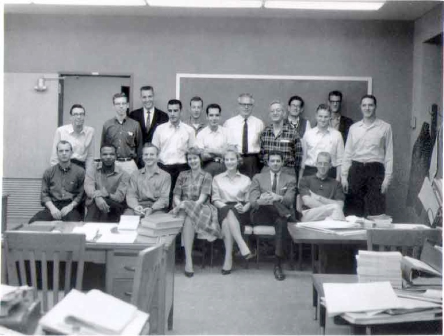 Back Row: Ronald Poshusta (Now Chemistry Faculty Washington State U., Larry Ellzey, F. A. Matsen, Douglas J. Klein, Mike Greenwalt Front Row:, Donald Zetik (post-doc, later worked at Cit-Go), ? Undergrad secretary, Bob Junker, later at U. Georgia and then ONR, Mary Watson. Others in the group but not the photo were Lanny Miller & Lewis Ford (IDs by Larry Ellzey and Doug Klein) |