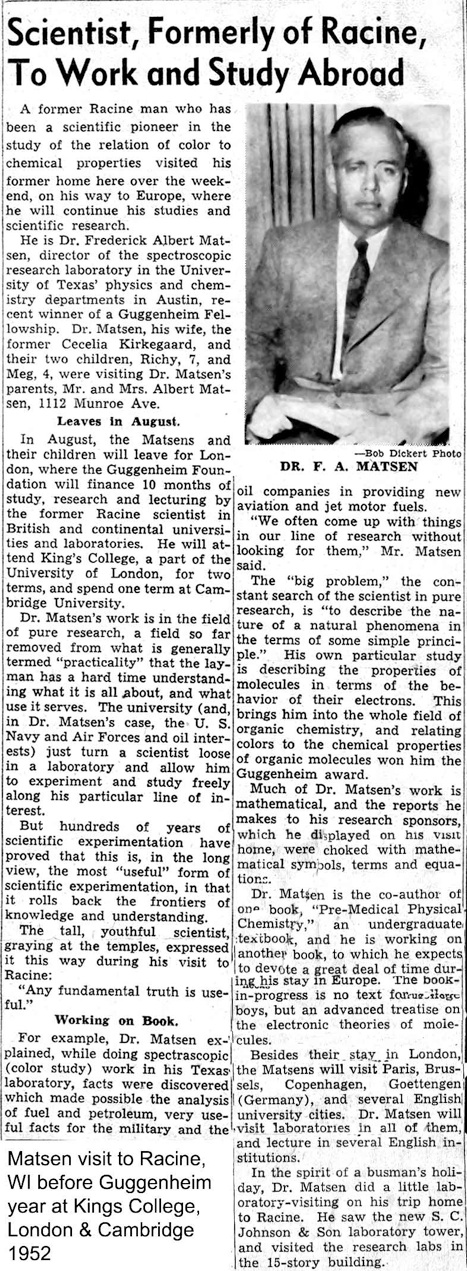 Dr. Matsen’s career began at Bucknell University where he was an instructor from 1940–42. In 1943, he came to the University of Texas where he remained until his retirement in 1988. His first research was on the theory of liquids. In 1945, he spent one year at the University of Chicago working with Robert Mulliken, Clemens Roothaan, and John Platt. Al developed a spectral theory that was good enough to impress Linus Pauling, who, as a member of the Guggenheim Committee, was responsible for his working with Professor Charles Coulson at King's College London and Oxford in 1951–1952. In 1955, the University of Texas acquired an IBM 650 computer on which Matsen, J. C. Browne and others made many calculations. Matsen’s Quantum Chemistry Integrals and Tables were computed on this machine. Matsen was a consultant for Exxon Houston and New Jersey for over 35 years. In his Reminiscences (see at end of this page) he relates a story “Amusingly, I had been lecturing at an unnamed university on the unitary group formulation of the many-body theory. I apparently went way over the listeners' heads since the only question I got was, What possible use could you be to Exxon?”