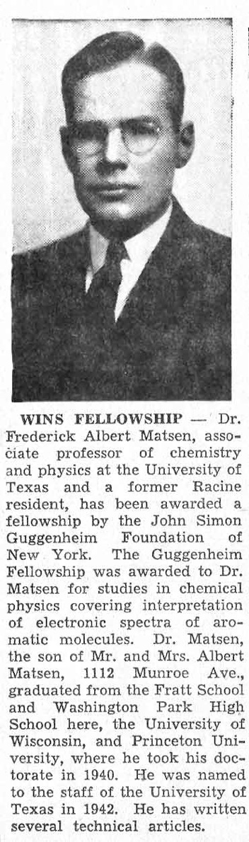 Frederick Albert Matsen Jr., Professor Emeritus of Chemistry and Biochemistry and of Physics, died on May 30, 2006. He was 92. Matsen was born in Racine, WI in 1913 to Frederick Albert and Carrie Iversen Matsen. Albert and Carrie were Danish immigrants arriving in the United States in 1910 and 1909 respectively. They were married in 1910. Albert was a barber who owned his own shop. Danish was the language spoken in the home. On the 24 of April 1927, Albert and Carrie had their son Frederick Albert Matsen, confirmed into Gethsemane Luthern Church of Racine, Wisconsin.