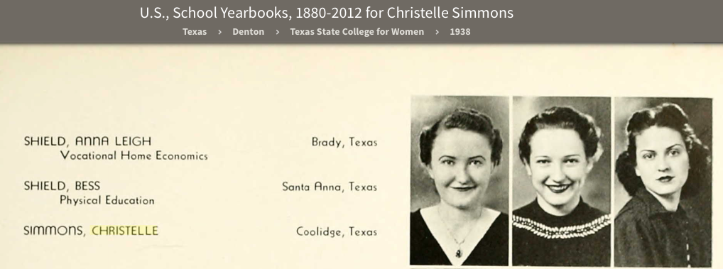 In 1951, Wayne married Christelle Simmons. She had attended Texas State College for Women. Her school photo in 1938 is as below.