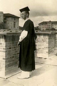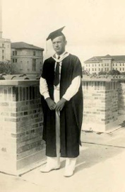 Wayne completed his master’s at the age of 21. He is seen at left, in his senior gown, in front of Painter Hall, 1935. At right, he is in his master’s regalia, 1936. Following graduation, he received a scholarship to attend Harvard to pursue his PhD studies, which were interrupted by America's entry into World War II. Like many young scientists, he participated in joint efforts between academe and the military to solve technical problems. He spent the war years at Harvard investigating vibration and noise levels that interfered with communication systems among crew members, both in aircraft and within vast aircraft carriers. This experience confirmed his fascination with sound and human hearing, which he fulfilled by his lifelong work in acoustics, then an emerging field of research within experimental physics. In 1946, he completed his dissertation and received his PhD. His thesis was entitled, “Sound Spectra in Aircraft as Influenced by Acoustical Treatment.” The work was done under the supervision of L. L. Beranek, director of the Harvard Electro-Acoustic Laboratory. The work was published in J. Acoust. Soc. Am., vol. 19, pp. 357-364, 1947.