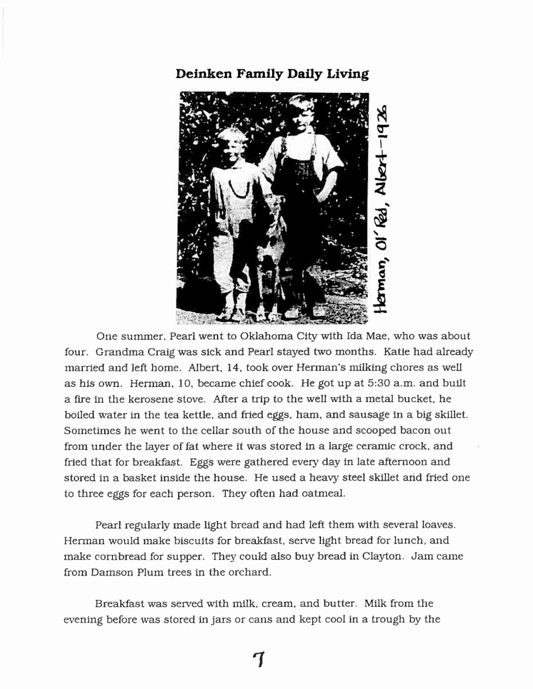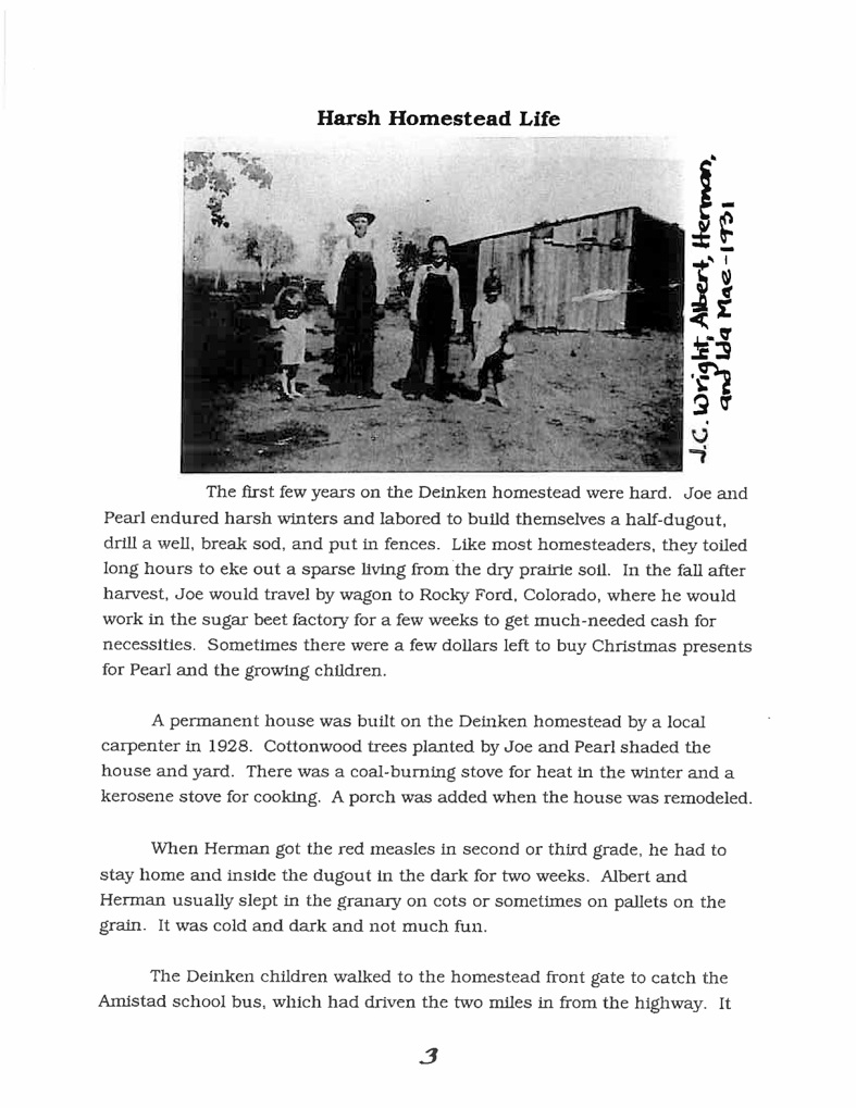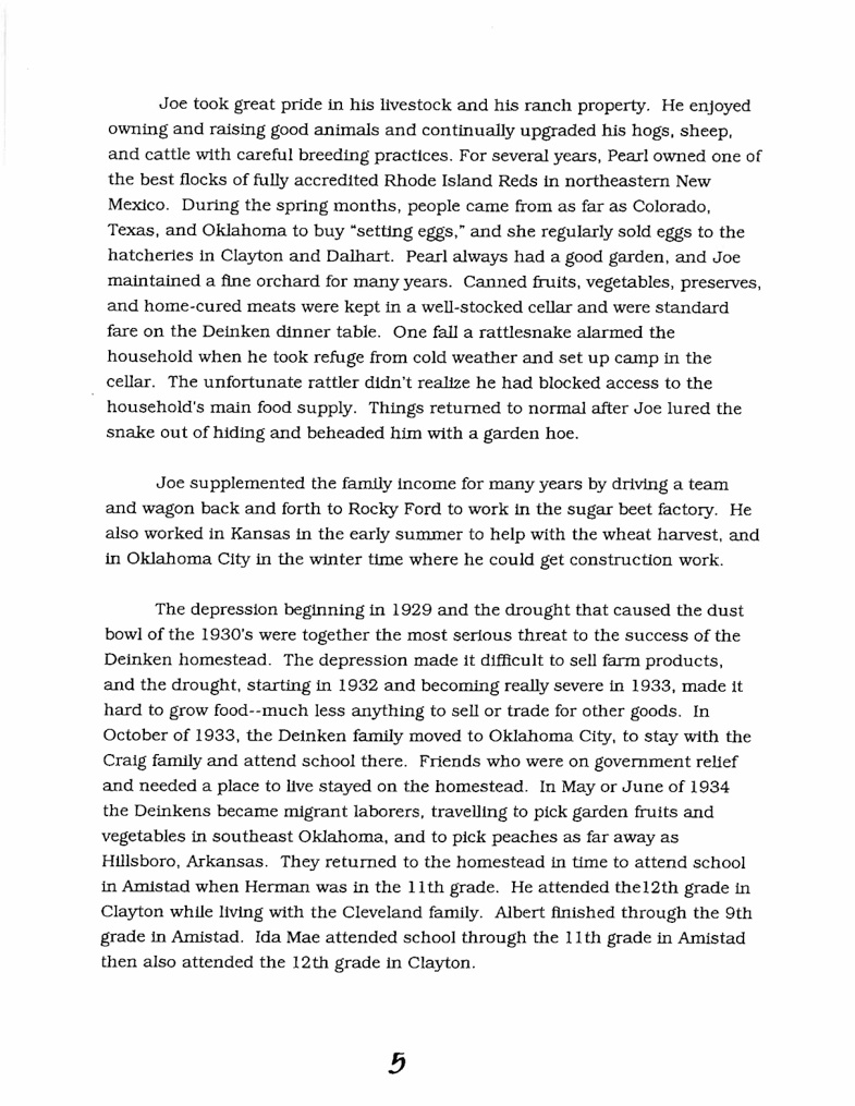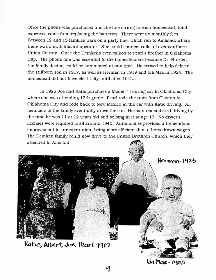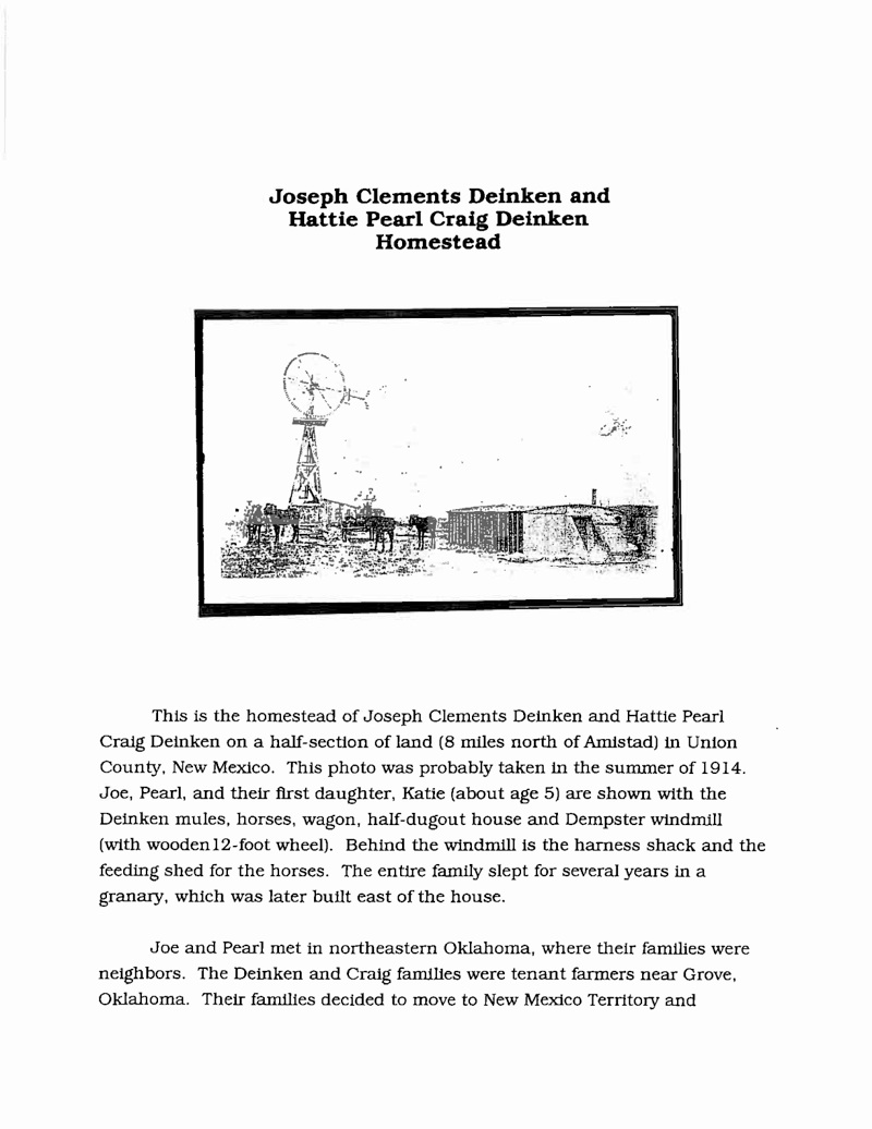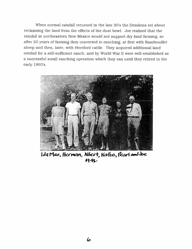 Dr. Herman P. Deinken, 90, died peacefully at home in Albuquerque on Monday, December 7, 2009 surrounded by loved ones. Born on April 9, 1919 near Amistad, NM, Herman grew up on the Hattie Pearl and Joseph C. Deinken homestead in Union County. His father, Joseph Clements “Joe” Deinken (1881–1965), was the son of Anton Bernard Deinken and Miss Catherina Sidler. Joseph was a pioneer of Union County, NM. He came to Union County, NM in 1907 with his mother, two sisters and two brothers. His mother, Hattie Pearl Craig Deinken, was born on July 18, 1886 at Springfield, Missouri to Franklin Porter Craig and Alice Lovelace. She died on September 14, 1963 at the Coon Memorial Rest Home in Dalhart, Texas. She married Herman’s father, Joseph C. Deinkin, on March 19, 1908 at Clayton, Union County, New Mexico. Joseph and Hattie had four children, left to right, in 1942 photo: Ida Mae, Herman Porter, Albert J., Katie, Hattie and Joseph.