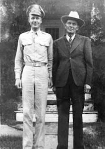Herman obtained a degree in Agriculture/Animal Husbandry from Texas Tech. He enlisted in the army on March 19, 1942. in Lubbock, TX. He did cadet training at Fred Harman Training Center, Bruce Field, Ballinger, Texas. We see at right a cadet picture and below a picture with his father in 1946. After the war, Herman returned to the U. but was not demobilized immediately in order to ferry new aircraft to various destinations around the country. He was stationed for a time at Love Field in Dallas, where he reconnected with Elizabeth Fonda MacWilliams (Betty). They had met at the First Presbyterian Church in Lubbock before the war. They were married on April 13, 1946, in Tyler, TX.
