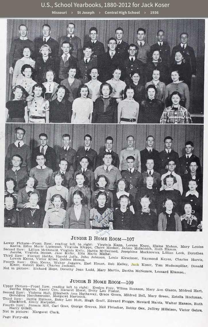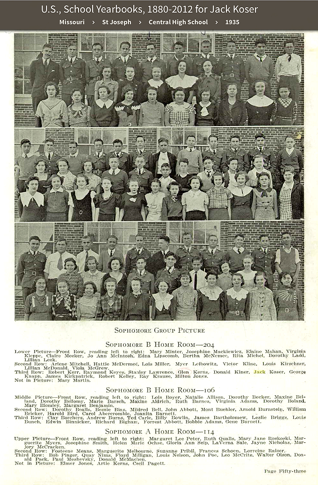 Jack Koser, sophomore, 6th from left, back row, lower photo, in dark suit, Central High School yearbook, Wakitan, 1935, |