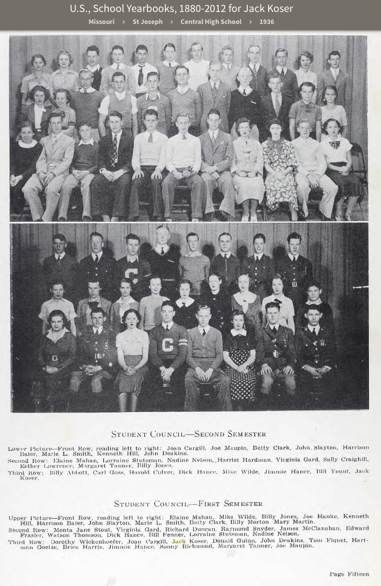 Jack Koser, Student Council, back row, 3rd from left, upper photo, Central High School yearbook, Wakitan, 1936. |