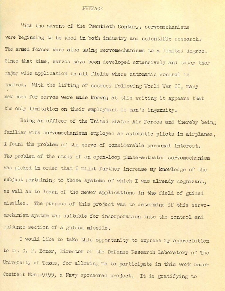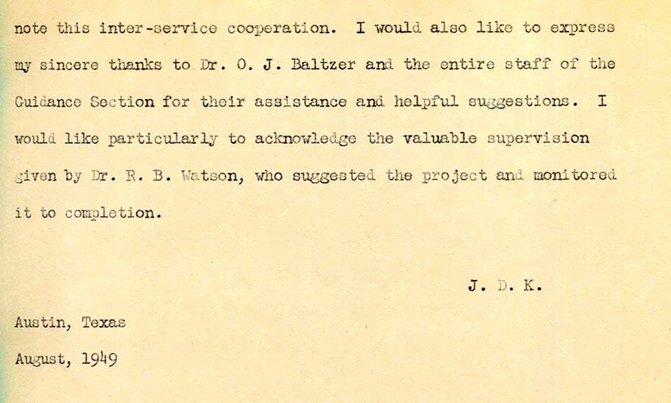 After the war ended, Jack entered the University of Texas at Austin in September, 1946 and received his BS in physics in 1948. In February 1949, he was awarded the degree of bachelor of arts in mathematics. He entered graduate school at UT in September 1949. In 1949–1950, he earned a master of arts in physics. His thesis was titled, An open-loop phase-actuated servo. The work was supervised by Professor Robert B. Watson and conducted under a US Navy sponsored project. Jack chose this project to learn more about servos which had played a prominent role in the aircraft he had flown. He believed they would play a major role in the development of guided missiles. Other members of his committee were Professors S. Leroy Brown (physics) and R. N. Haskell (mathematics).