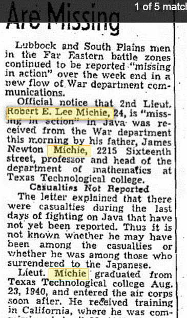 James and Hazel's son, Robert Lee Michie, was reported missing in Java. As the second newspaper entry reports, he was taken prisoner by the Japanese and was freed after the war ended.