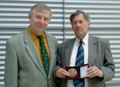 Jürgen Ehlers, the founding director of the Albert Einstein Institute receives the Medal of the Charles University in Prague, September 25, 2007. During a ceremony at the Institute, Prof. Jiří Bičák, Humboldt Award winner and a current scientific guest at the AEI, bestowed the Medal on behalf of the Dean of the Faculty of Mathematics and Physics. Jiří Bičák (l.) and Jürgen Ehlers (r.). The “Memorial Medal” of the Faculty is bestowed upon high-ranking scientists who have been engaged in close cooperation with the Charles University in Prague. Prof. Ehlers, who has been researching relativity theory and cosmology together with Prof. Bičák for more than 40 years, has been singled out for his outstanding achievements in the field of relativity theory, in particular the exact solution of Einstein’s equations, his work on the theory of gravitational waves and gravitational lenses, as well as his contributions to cosmology and other research areas. “I am very pleased with this recognition of my scientific work,” says Ehlers. “The exchange of ideas with my Prague colleague has stimulated interesting research topics and led to joint publications.” Jürgen Ehlers is one of the most influential theorists of gravitational physics in Europe. He deals mainly with questions regarding the general theory of relativity and cosmology.