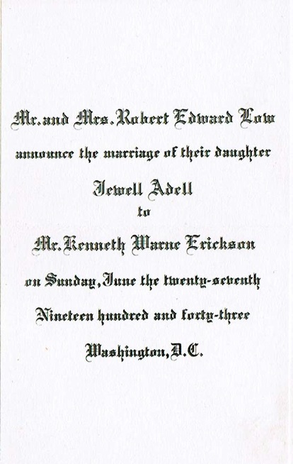 According to his UT classmate and lifetime friend, Neal Clarkson, Ken worked as a maintenance man at Kirby Hall. It was there he met his future wife Jewell Adell Low. They were married in Washington DC, June 27, 1943.