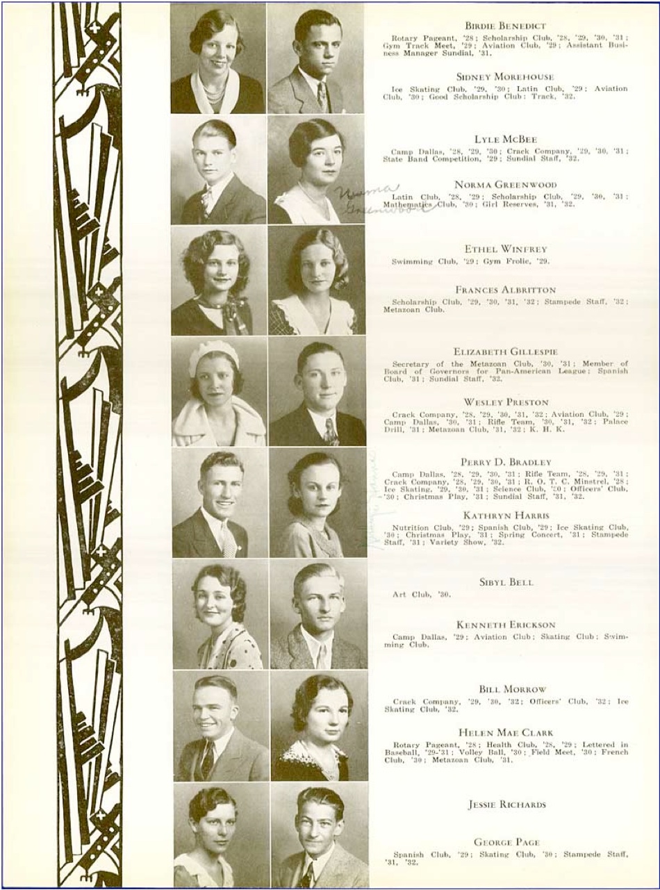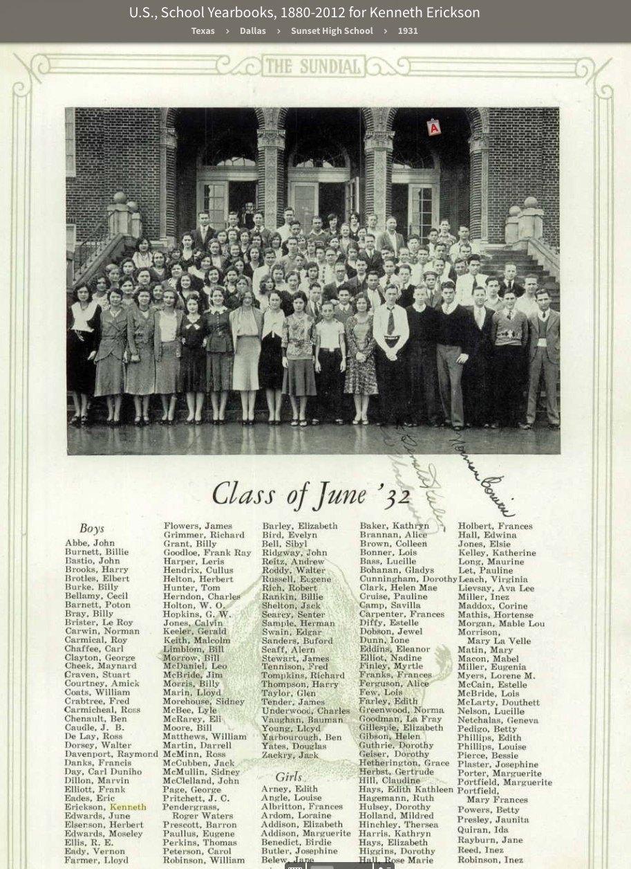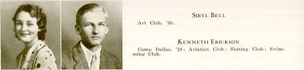 Ken and his sister Edra both attended Sunset High School in Dallas. Edra graduated in 1930 and Ken in 1932. His yearbook picture indicates his participation in Aviation Club, Skating Club and Swimming Club.